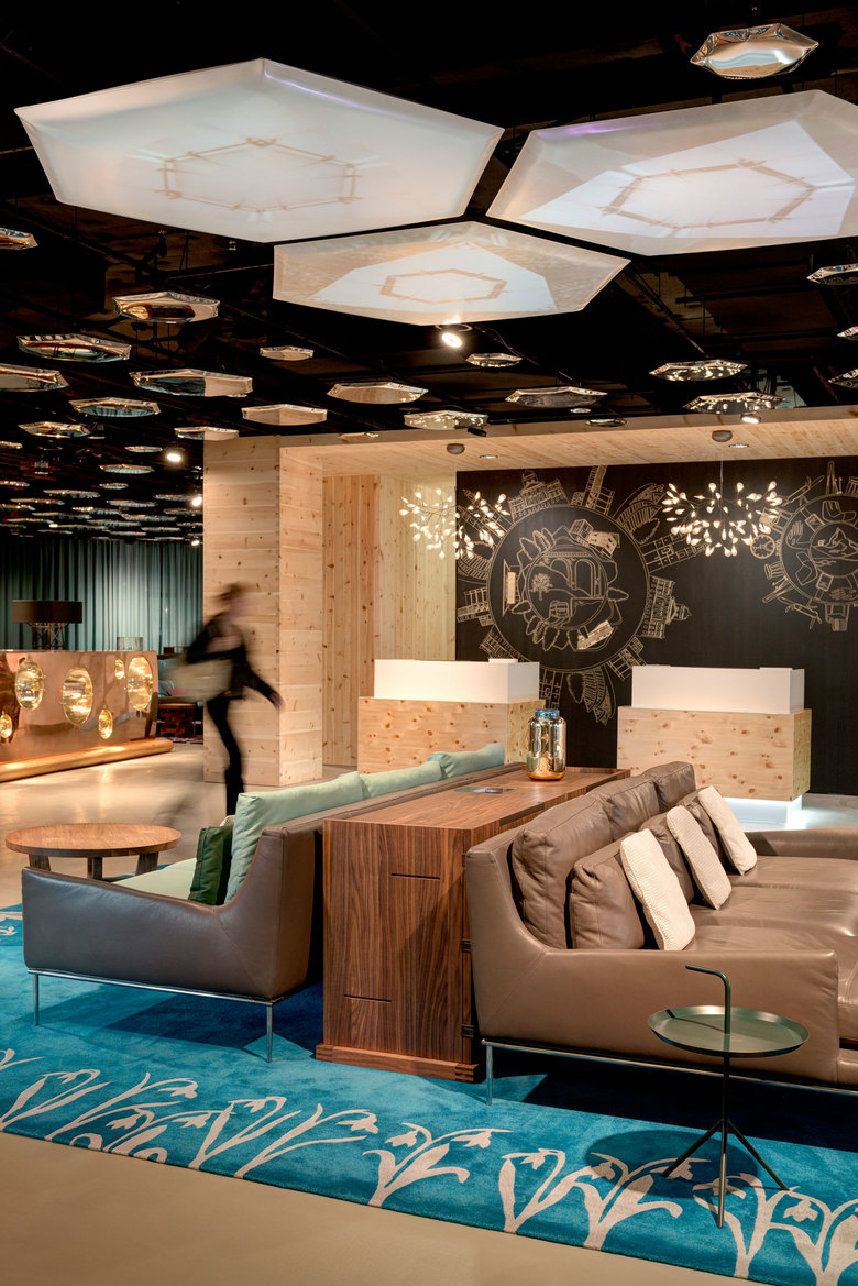 Die Gäste des höchsten Hotels der Stadt Zürich erwartet moderne Swissness in Form einer ansprechenden Verschmelzung von Tradition und Moderne. Neben den Designmöbeln aus natürlichen Rohstoffen wie zum Beispiel Arvenholz ist eine Besonderheit der neuen Lobby mit Sicherheit die künstlerisch inspirierte Installation zum Thema Schnee. Über die gesamte Decke verteilt hängen gravierte Chromstahlelemente, welche Schneeflocken abbilden. Diese Lobby bietet eine Wohlfühlatmosphäre wie zu Hause, aber auch Effizienz in den Abläufen.