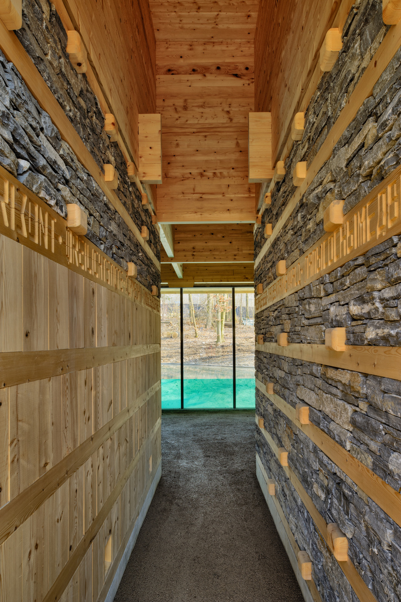 sondern einen sehr schlichten Bau aus den Naturbaustoffen Stein und Holz vor.