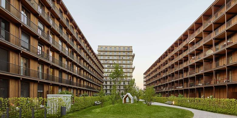 Drei sechsgeschossige Wohnbauten in Minergie-P ECO Standard sind mit Ausnahme der Treppenhäuser komplett als Holzbauten realisiert.