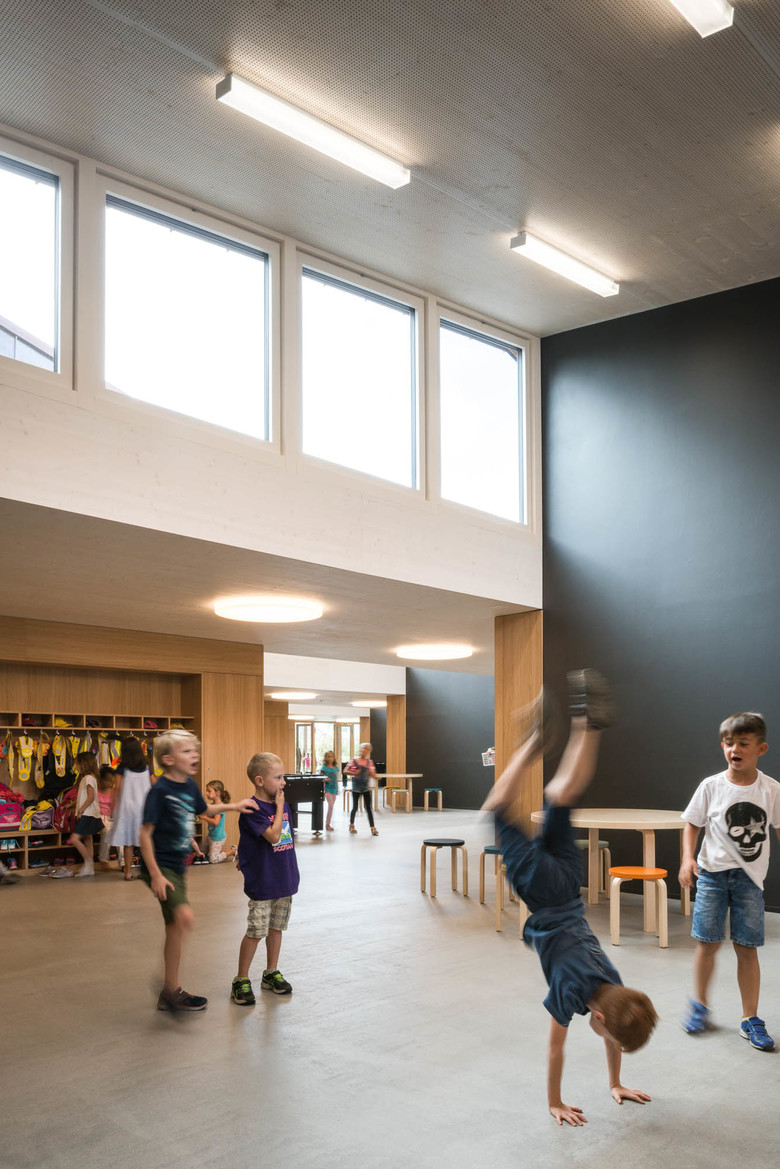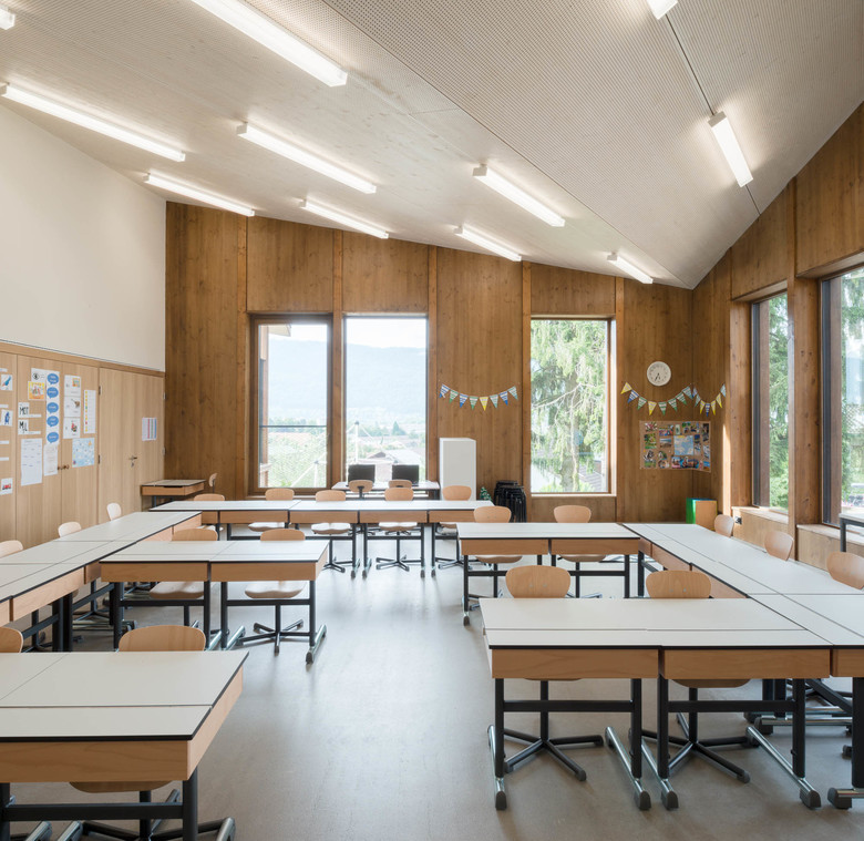 über die Klassenzimmer, was Spannweiten bis zu 13.0m ergibt. Um die Fassadenkonstruktion im