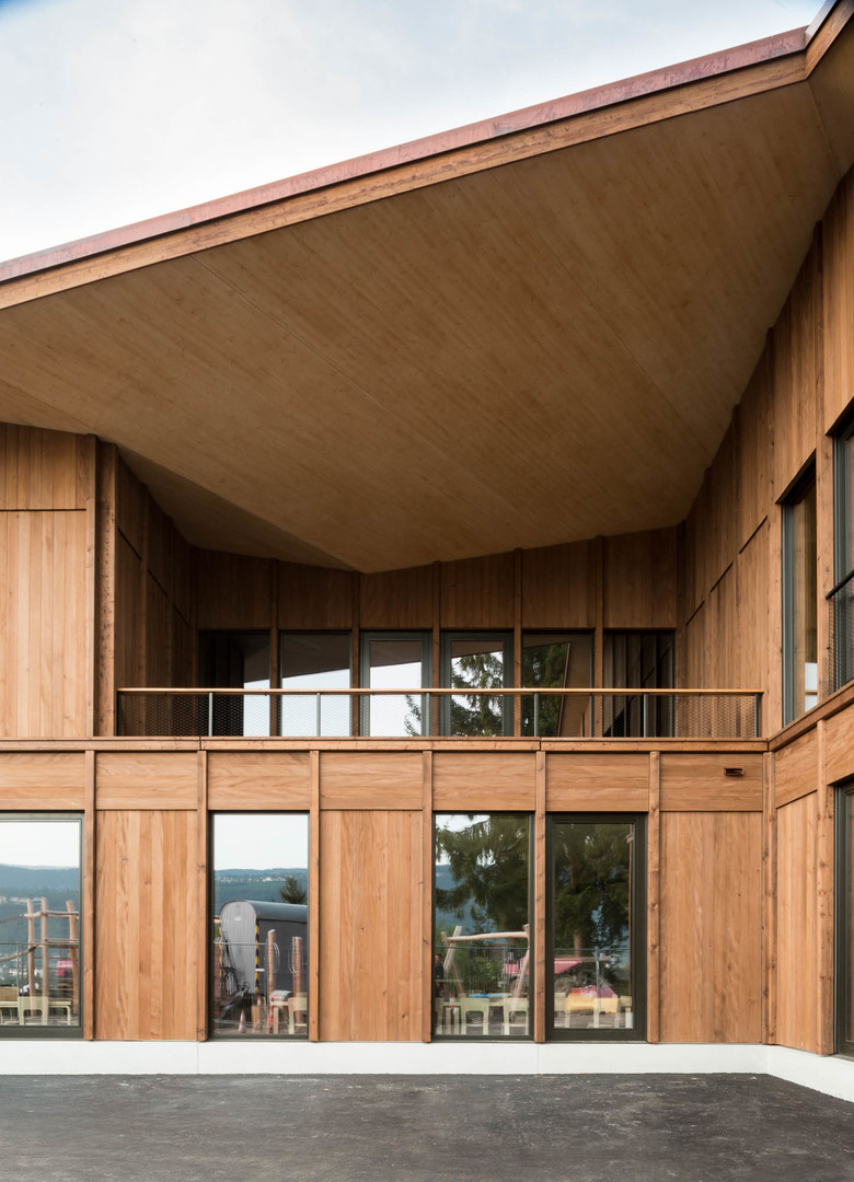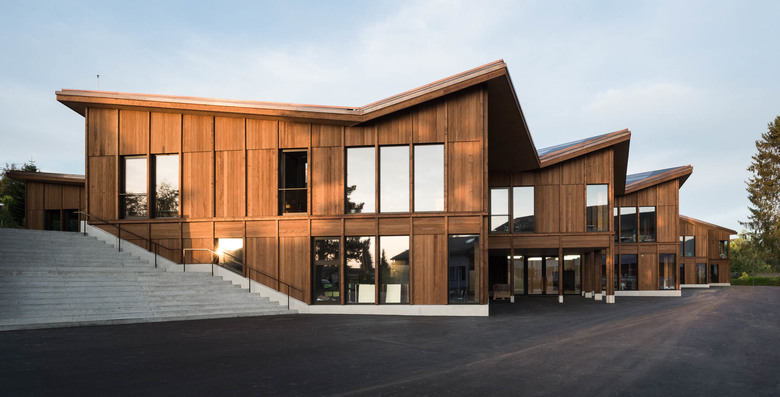 Holzelementbau realisiert. Die Dachkonstruktion spannt parallel zu den Firsten, somit diagonal