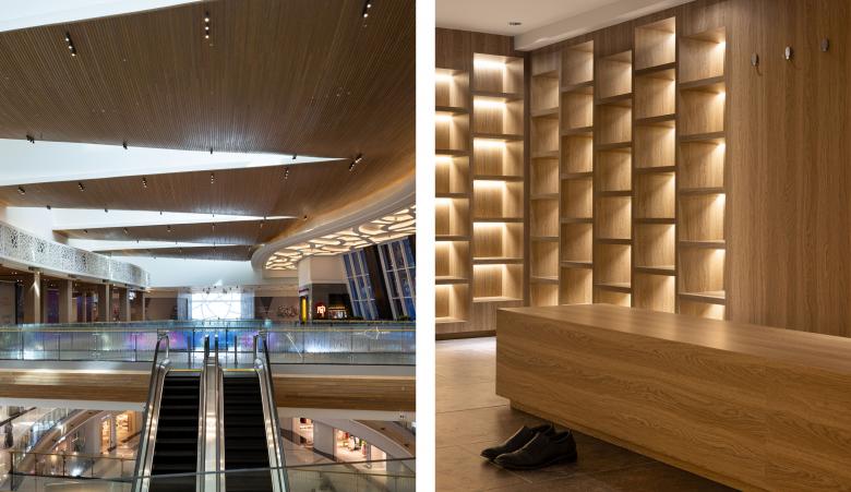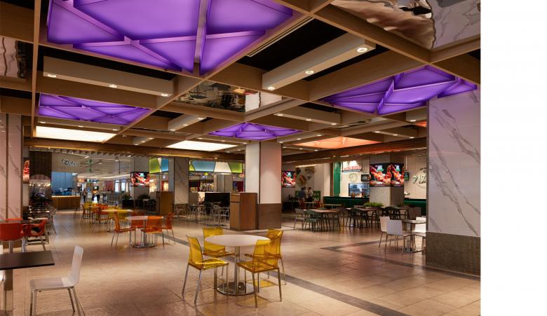 The Mangrove Atrium, the heart of the mall, is the largest open space, programmed to host different events and acts as the main access point from the parking levels situated above ground. On the top floor, the Mangrove Food Court evoques the mangrove forest with patterned columns in shades of green and blue which emerge like trees, with two skylines that fill the space with natural light.