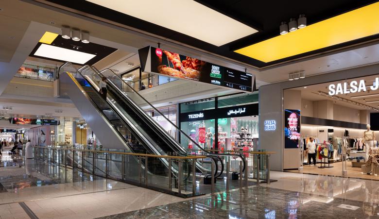 This notion allows to create a unique interior space based on the beauty of the context where the development is located. The north side of the mall accentuates the connection to Reem Island Bridge through the sharp angles which join the different levels, creating a dynamic effect which is highlighted by the patterned glass ceiling. The south side overlaps volumes by dividing the space into individual crystals which orientate visitors through the interconnected spaces. This transition is overlapped, reinforced by layers of paving patterns and materials.