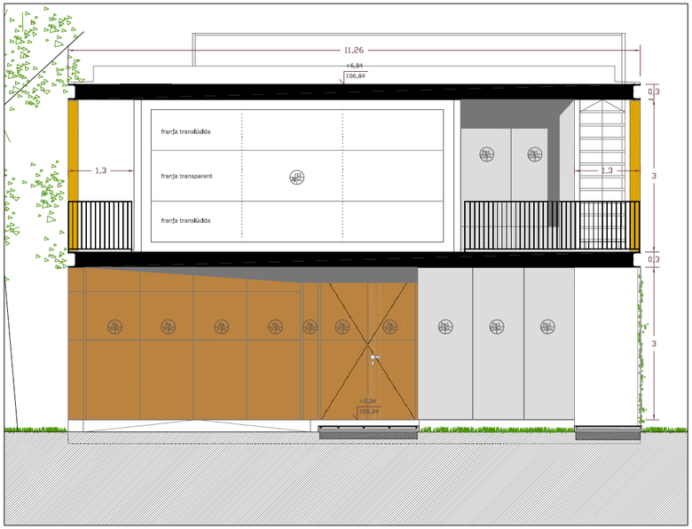 House clearly divided in two areas, a ground floor connecting with all the exterior, and an upper level that searches for a great deal of privacy from the neighbours. The house follows the main entrance axis as an excuse to relate to the exterior. Lateral facades happen to be more eclectic and neutral. Trying all time to disallow the others to know what’s going on inside. Lower program is dedicated to day related activities, leaving the upper level to bedrooms and a common open–studio space. The roof is proposed as an open and active roof, for the users to enjoy the Mediterranean climate.