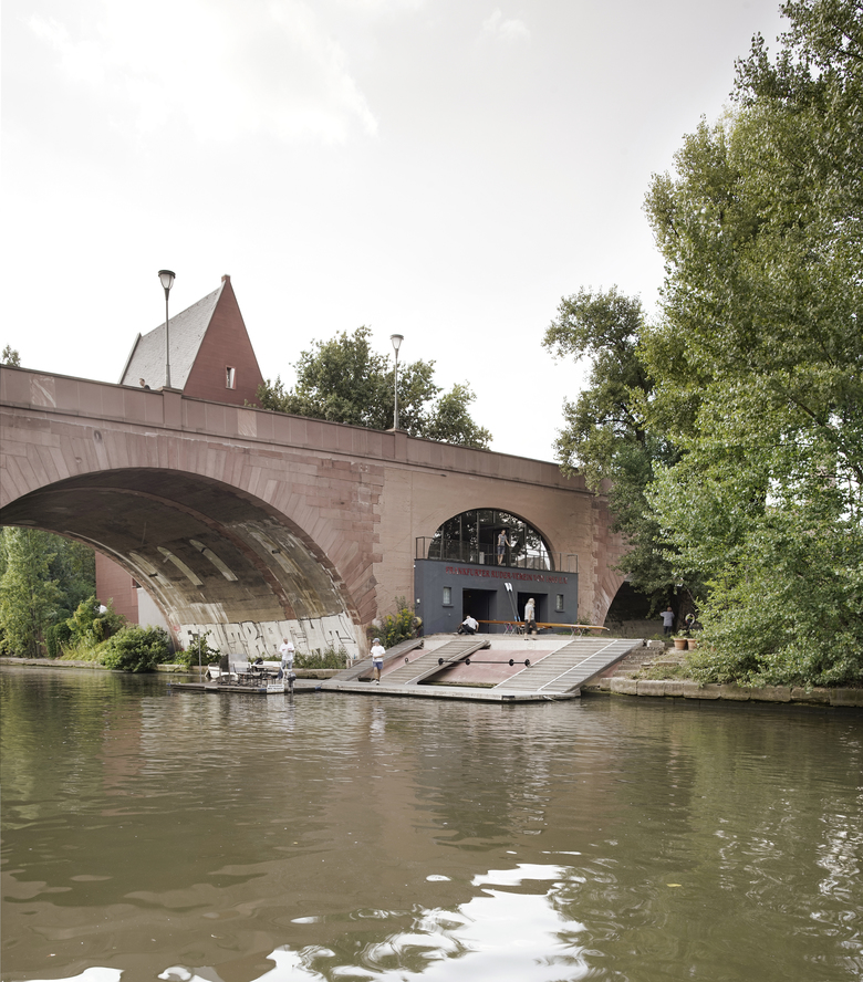 Unser Entwurfskonzept begreift das zweigeschossige Bootshaus als einen Baukörper, der durch den Brückenbogen durchgesteckt ist, wodurch ein aktiver Bezug zum Stadtbild hergestellt wird. Alle Bauteile wurden durch ein einheitliches Farbkonzept abgestimmt, um sie an einem stadtbildprägenden Ort wie der Maininsel und zusammen mit der Alten Brücke wieder zu einem stimmigen Ensemble zusammenwachsen zu lassen.