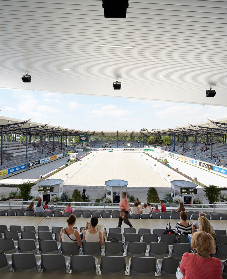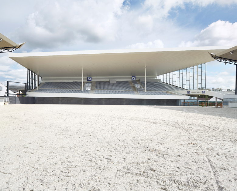 Auf dem CHIO – Gelände des Aachen Laurensberger Rennvereins im Sportpark Soers sind die zahlreichen vorhandenen Reitsportstätten um eine neue Tribüne erweitert worden. Diese ergänzt das bestehende Dressurstadion und schließt damit die vierte bis dato noch unbebaute Flanke auf der Ostseite. Der Entwurf gliedert sich funktional in zwei Elemente: Den Tribünen-Körper mit Zuschauerplätzen, der großen Freitreppe und dem weit auskragenden Dach sowie die darunter liegenden Funktionsräume. Die Zuschauertribüne im Obergeschoss wird von einer großen Freitreppe erschlossen und bietet Platz für ca. 1200 Besucherplätze. Das bis zu 16 Meter hohe und rund 18 Meter weit auskragende Dach und die seitlichen Glasfassaden schützen die Besucher vor Witterungseinflüssen. Unterhalb des Tribünenkörpers sind im Erdgeschoss alle Funktionsräume wie Sanitärbereiche, Lager- und Technikflächen sowie temporäre Nutzungen (Meldestelle/Turnierleitung, Besprechungsraum) angelagert.