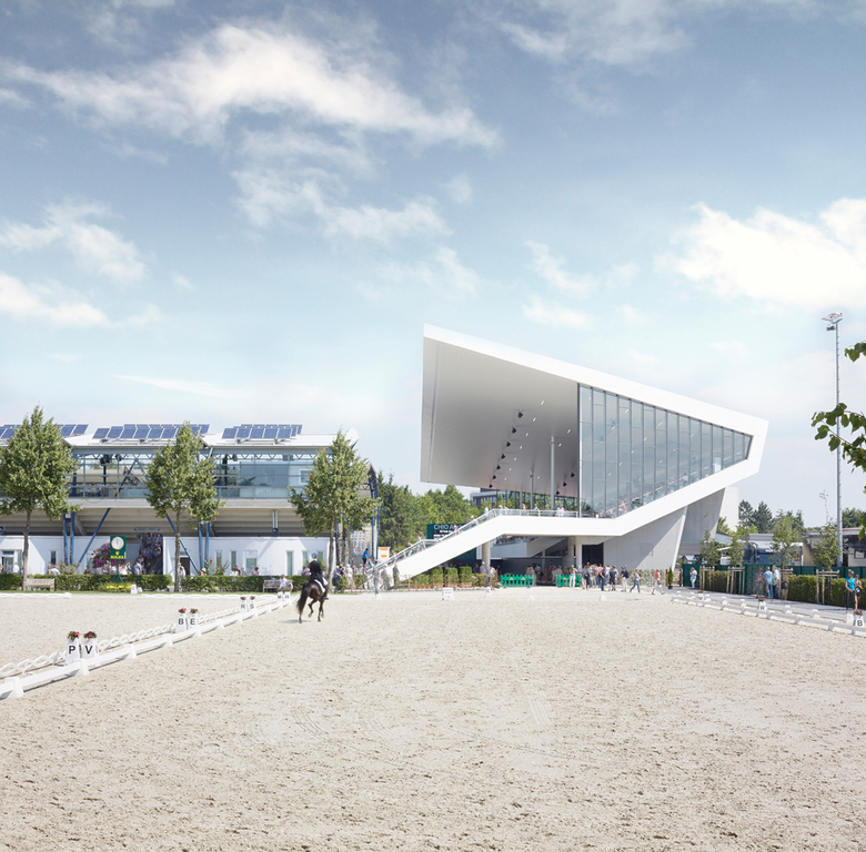BRIEF: Erweiterung des bestehenden Dressurstadions um eine Zuschauertribüne mit 1200 Plätzen und verschiedene Funktionsräume