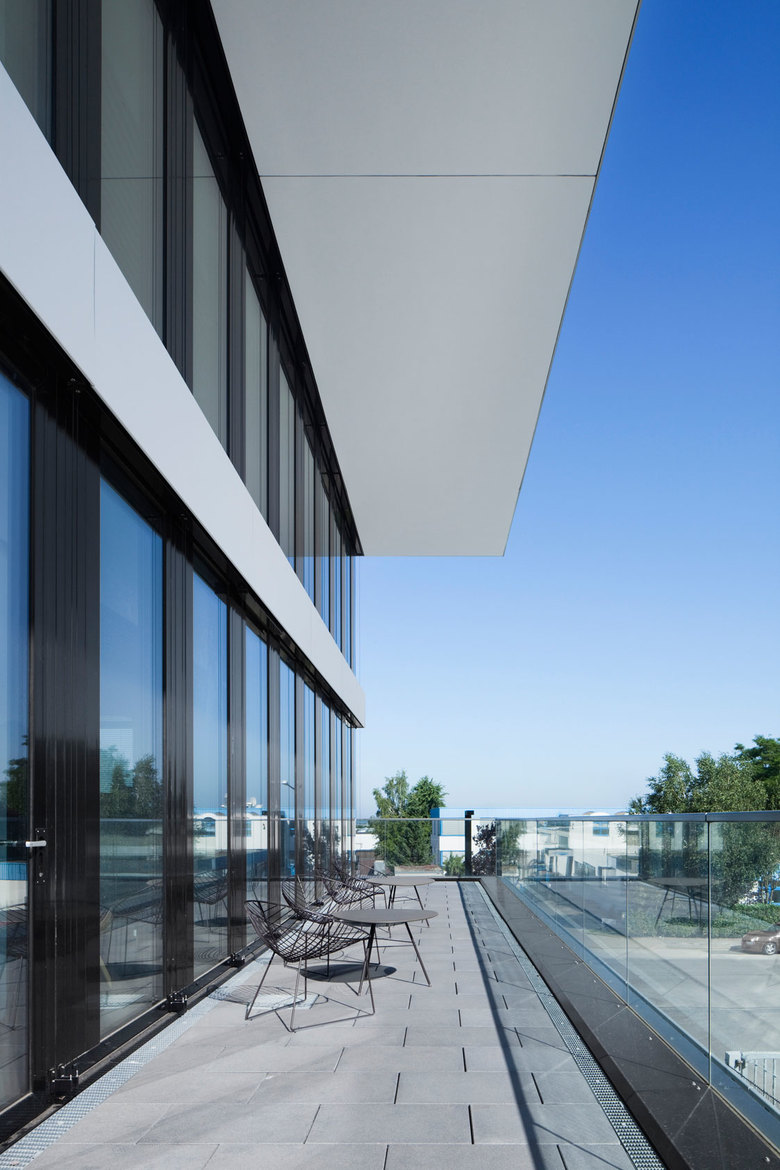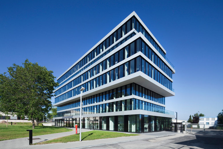 Das neue Bürogebäude bildet den neuen Eingangsbereich zum Grünenthal-Campus und schafft gleichzeitig eine moderne, kommunikative und flexible Arbeitswelt für rund 200 Mitarbeiter. Die sieben leicht versetzt zueinander liegenden Geschossdecken prägen nicht nur das markante Erscheinungsbild des Hauses. An den beiden Längsseiten des Gebäudes liegen die natürlich belüfteten und belichteten Büroarbeitsplätze, die flexibel an neue Anforderungen angepasst werden können. Darüber hinaus entstehen in der Mittelzone der Büroetagen zusätzliche Flächen für Kommunikation und Informationsaustausch, wie z.B. Meeting-Areas, Coffee-Points, Lounges, Archive oder Copy-Inseln. Die drei durch das Verschieben der Etagen entstehenden Terrassen im Außenraum eröffnen weite Ausblicke auf den Campus oder in den Aachener Landschaftsraum.