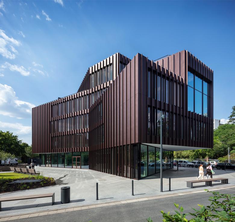 Wie große Schaufenster sind diese Raumaufweitungen im Erdgeschoss und über dem Haupteingang in der Fassade aus vertikalen Aluminium-Lisenen ablesbar.