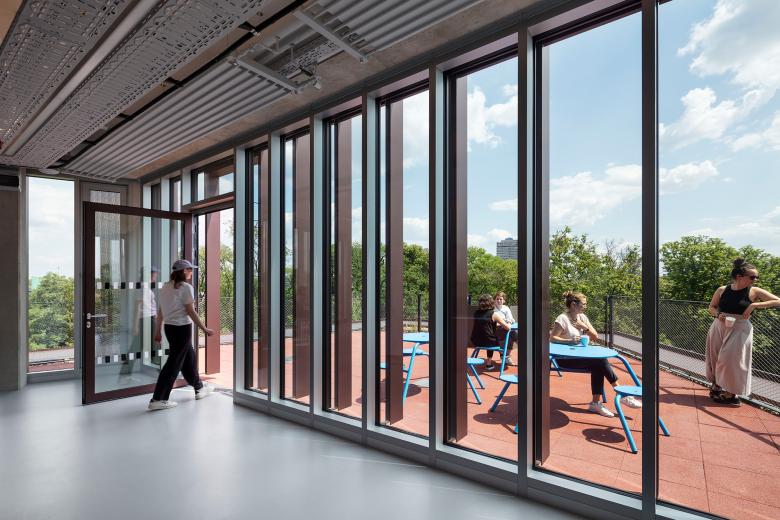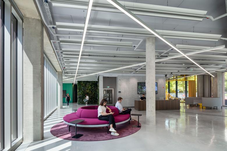 Im Erdgeschoss befinden sich neben dem Foyer mit Empfang, eine Cafeteria sowie zwei unterschiedlich große Meetingräume, die zu einer durchgängigen Vortrags- oder Ausstellungsfläche zusammengeschaltet werden können. In den Obergeschossen bieten offene Arbeitslandschaften und geschlossenen Büroräume eine flexible Umgebung für die Entwicklung und Realisierung innovativer Ideen. Dachterrassen und Außenbereiche bieten Platz für Austausch und Arbeit an der frischen Luft.
