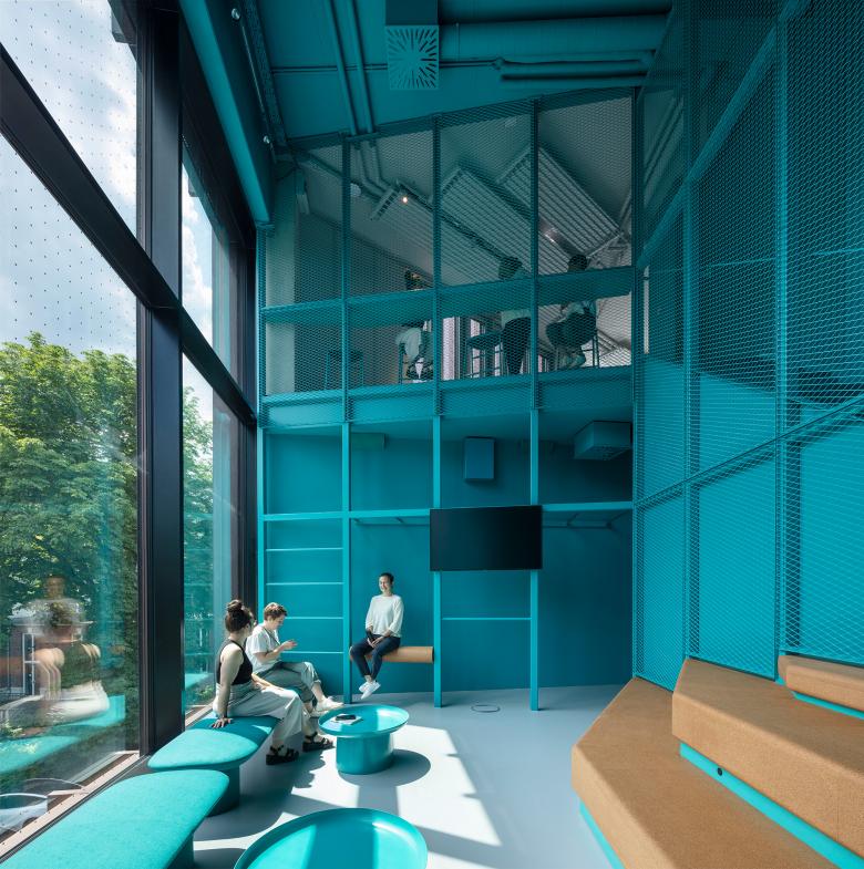 Das Raumangebot wird durch zwei doppelgeschossige Aufenthaltsräume – den sogenannten LIKE IT‘s *- ergänzt. Als Kommunikationsräume laden sie zum Verweilen mit Kaffee und Snack ein oder können für informelles Arbeiten, Besprechungen und Vorträge genutzt werden.
