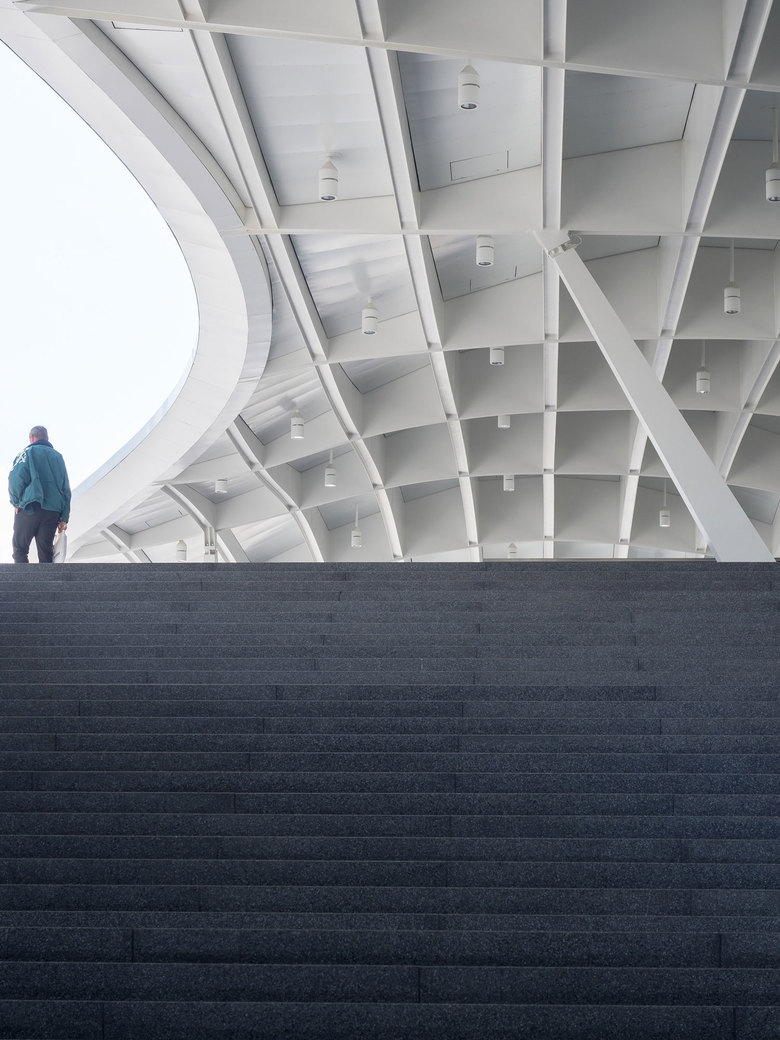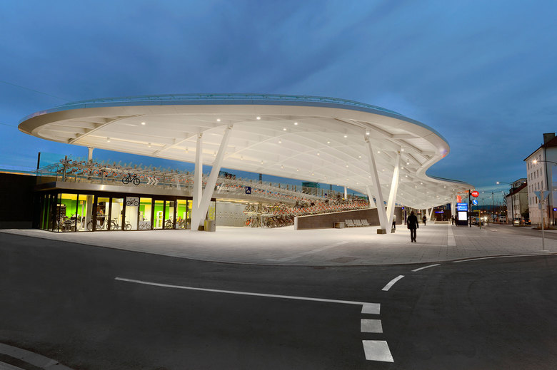Ein großflächiges, geschwungenes Dach markiert den neuen Bahnhofzugang im Stadtteil Schallmoos und überdeckt den Aufgangsbereich. Die parabolisch gekrümmte Dachfläche senkt sich im Bereich des Aufgangs aus der Passage ganz selbstverständlich dem Bewegungsstrom der Reisenden folgend hinab und weist so den Weg aus und in den Bahnhof.