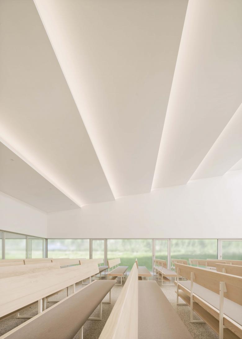 Der Kirchensaal bildet den Mittel- und Hochpunkt der Anlage. Eine kontinuierlich ansteigende, gefächerte Decke mit indirekter Beleuchtung unterstützt die gerichtete Raumanordnung mit Mittelgang und Ausrichtung auf den Altar. Die natürliche Belichtung wird neben dem Oberlicht über dem Altar durch eine großformatige, transluzente Verglasung nach Norden erreicht.