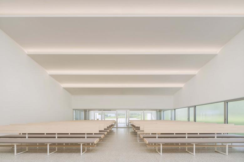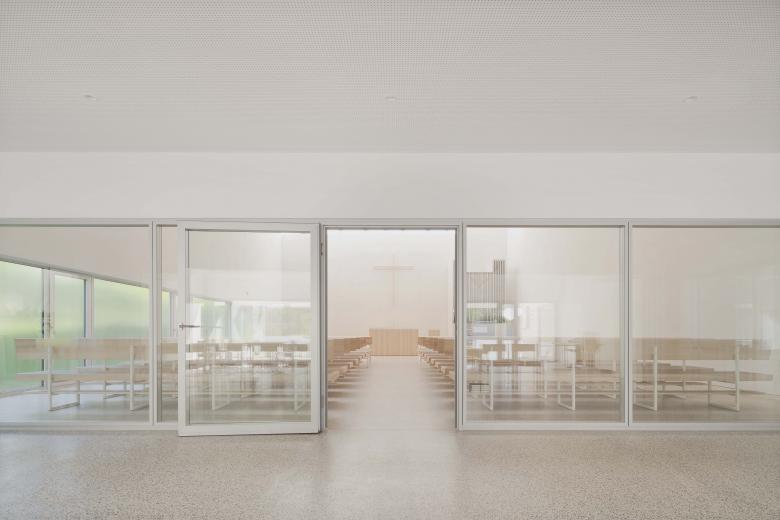 Das zentrale Foyer wird zwischen dem Kirchensaal und den nach Westen ausgerichteten Mehrzweckräumen angeordnet. So ergibt sich eine vielfältig nutzbare Zone, die über Schiebewände ein räumliches Kontinuum ermöglicht und den Sakralraum erweitert.