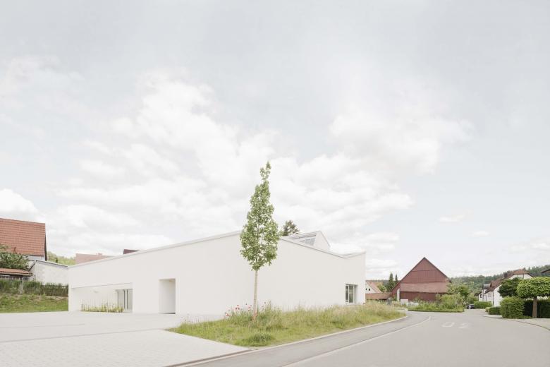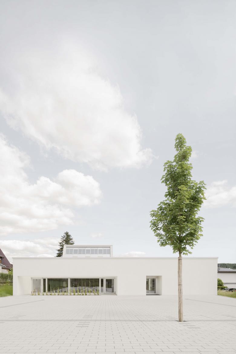 Die besondere Bedeutung des Sakralbaus tritt zudem durch die baukörperliche Ausformulierung des Volumens und dem aus der vorhandenen Topografie heraus entwickelten, leicht erhöhten Vorplatz in Erscheinung.