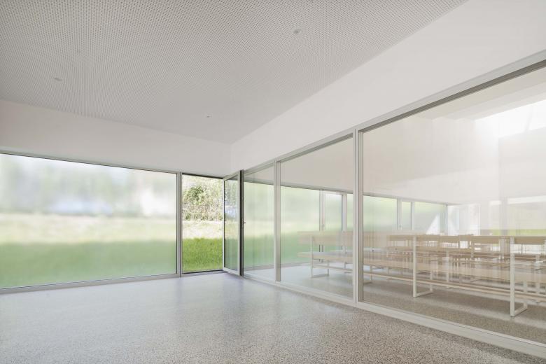 Die Innenräume erhalten einen durchgängigen Terrazzobelag auf Fußbodenheizung und mineralisch verputze Wandflächen. Die Einbauten sind aus heimischem Weißtannenholz gefertigt.