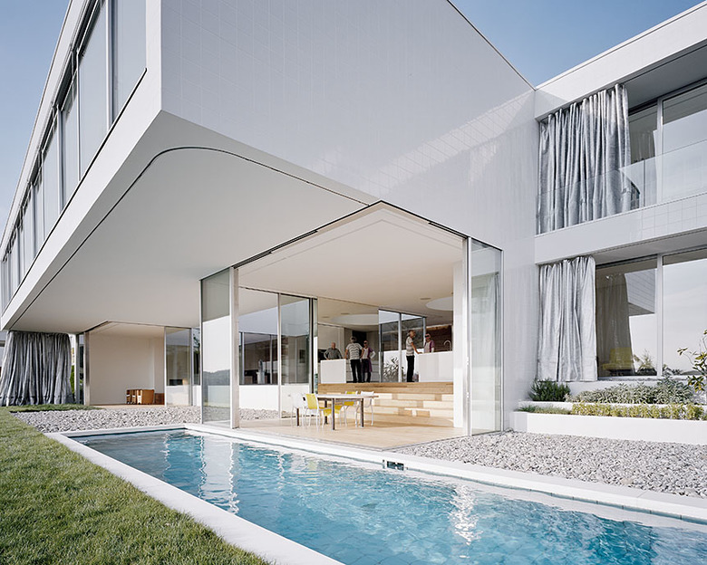 Vom Einfamilienhausgebiet ist dann nur noch wenig zu sehen. Offene Räume, eine raumhohe Verglasung mit dünnen Profilen, zoniert durch Stufen über die ganze Raumbreite, die in die Landschaft hinein führen, die Landschaft im Innern fortsetzen.