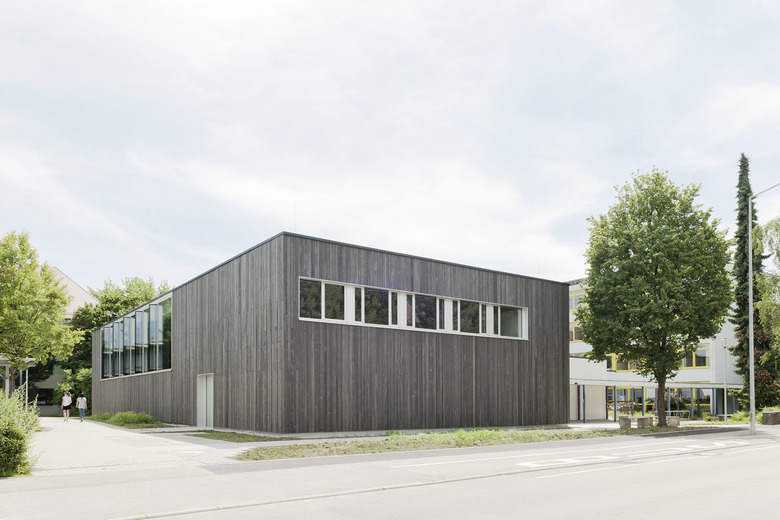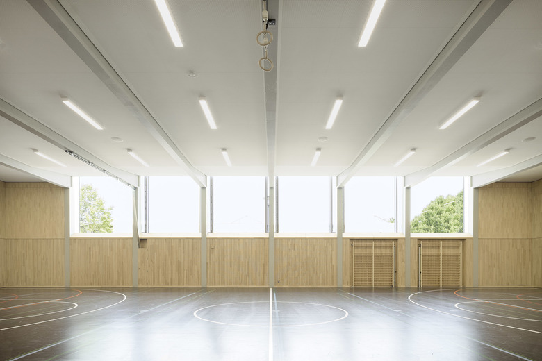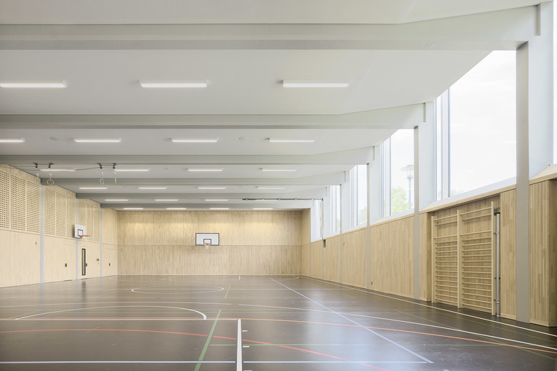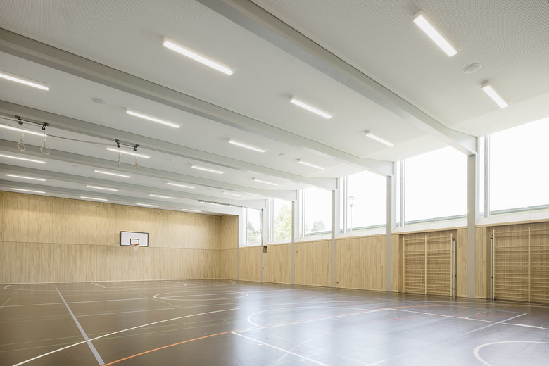 Durch eine homogene, vertikal angeordnete und hinterlüftete Holzverkleidung aus Weisstanne wird die Körperhaftigkeit des bestehenden Volumens gestärkt. Gleichzeitig konnten gezielt gesetzte neue Öffnungen realisiert werden. Eine großformatige Verglasung an der Nordseite der Halle ermöglicht eine natürliche, blendfreie Belichtung, ein außenliegender Sonnenschutz ist nicht notwendig. Integrierte Öffnungsflügel im Stützenbereich sichern die natürliche Nachströmung von Frischluft. Gemeinsam mit Lüftungsklappen auf der Südseite der Halle ist eine wirksame Nachtlüftspülung gewährleistet, auf eine Lüftungsanlage in der Halle konnte verzichtet werden. Lediglich die Umkleide- und Duschbereiche erhalten eine kontrollierte Lüftung.