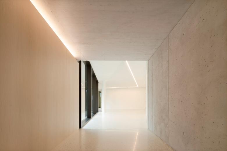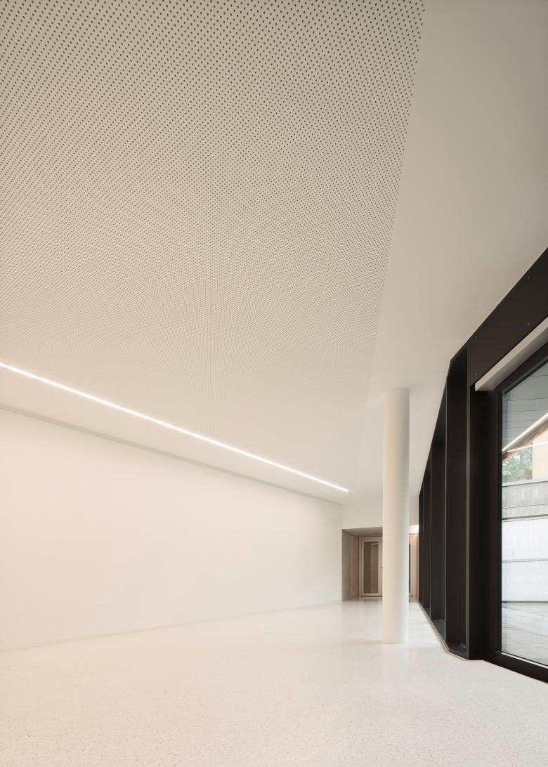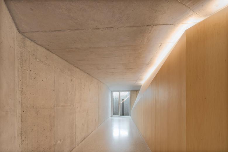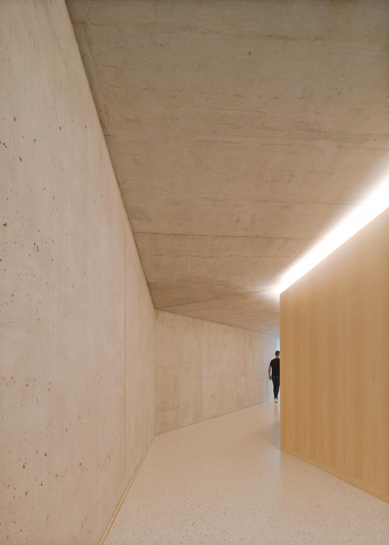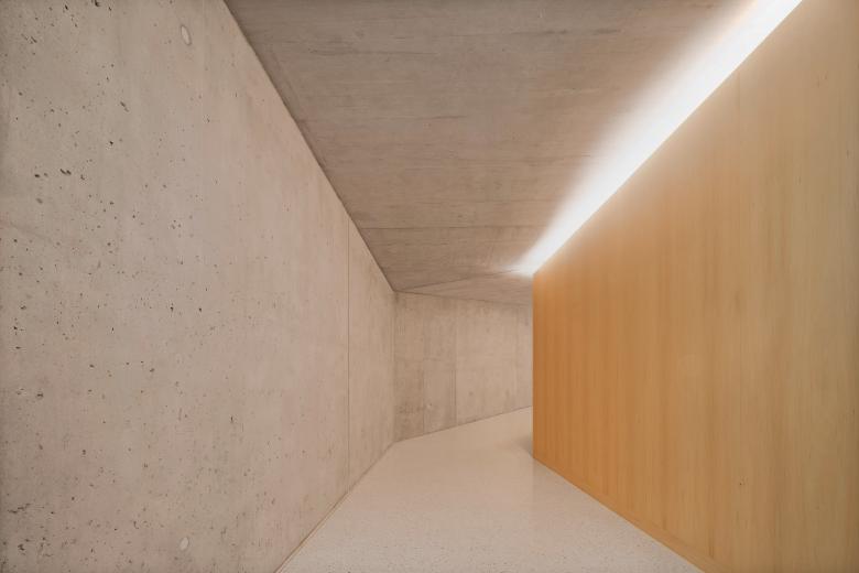 Sichtbeton an Stützwand und Decke, Terrazzo mit regionalen Zuschlagstoffen am Boden sowie eine warme hölzerne Schale aus heimischer Weißbuche prägen die innere Gestalt.