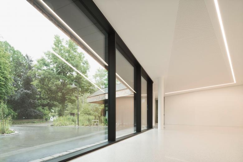 Unser Ansatz für das neue Zweckbauwerk ist das Ergebnis dieser vielfältigen Rahmenbedingungen. Eine Stützwand in polygonaler Abwicklung hält den Hang zurück und knüpft an funktional sinnvollen Stellen an die Bestandsgebäude an. Im östlichen Bereich ist die Anlage erdüberdeckt, eine Überfahrung für Feuerwehr und Traktoren gewährleistet. Nach Westen öffnet sich die talseitige Fassade zu einem neuen, ebenerdigen und einladenden Foyer.