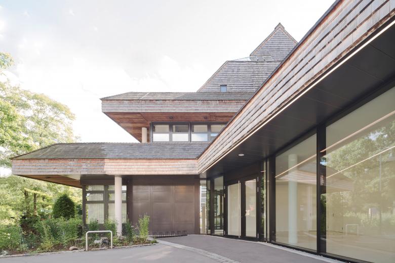 Der in Erscheinung tretende Bereich ist in Form, Detail und Materialisierung aus der Anmutung des Haus Vinzenz abgeleitet: Beton-Primärstruktur aus Rundstützen und Flachdecken, Holzschindeln am Dach und Aluminiumfassaden – eine unsichtbare Architektur.