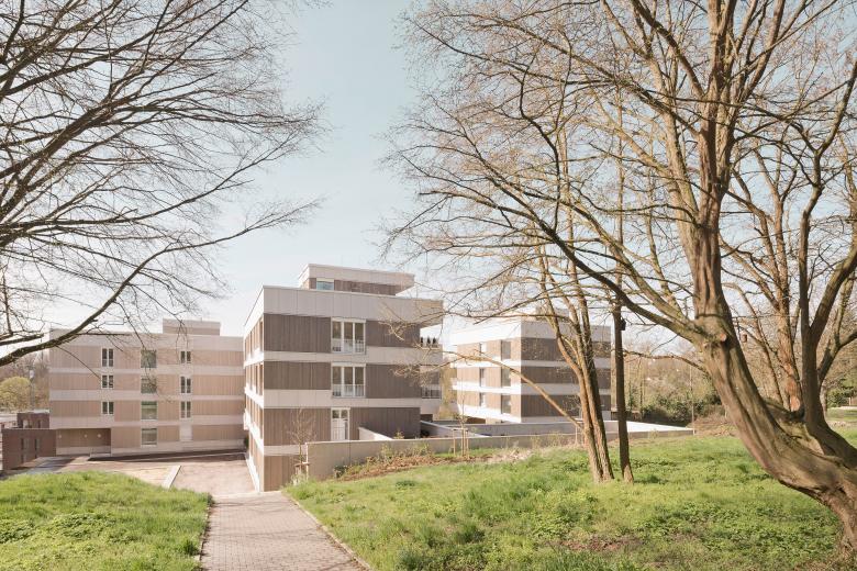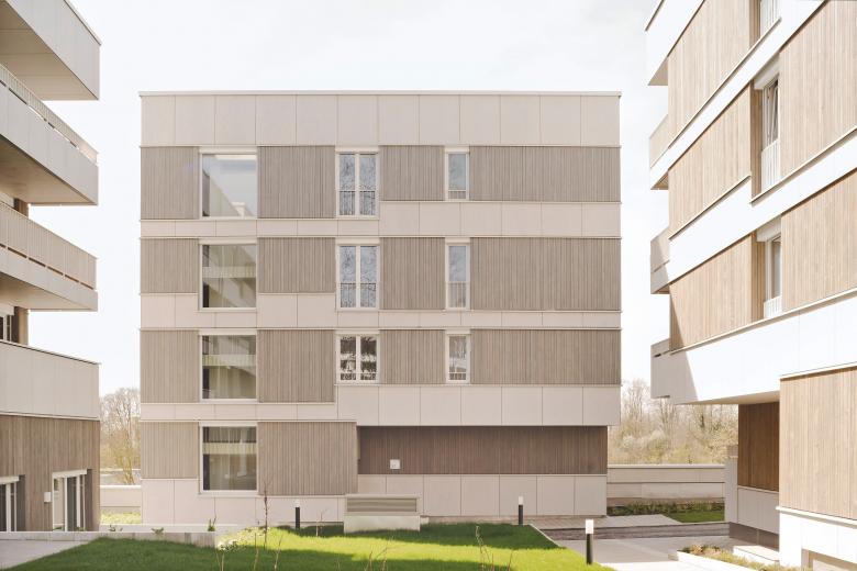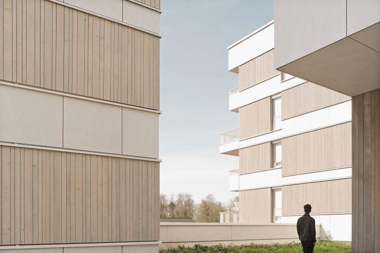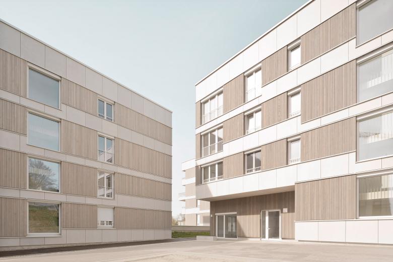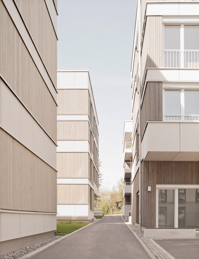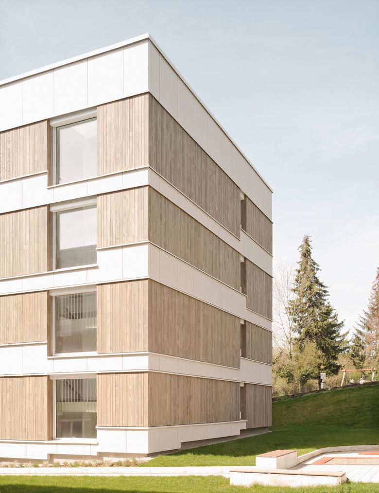 Die vier Gebäude gliedern sich durch eine geschossweise ausgebildete, kräftige horizontale Bänderung. Unterschiedliche Brüstungshöhen erzeugen ein abwechslungsreiches Fassadenbild. Die Vielfalt und Differenzierung der Häuser wird dabei durch eine unterschiedliche Farbigkeit der vorvergrauten und hinterlüfteten Weißtannenschalung unterstützt.