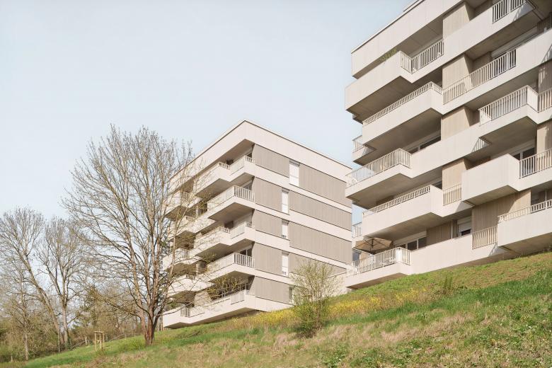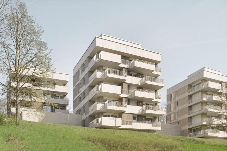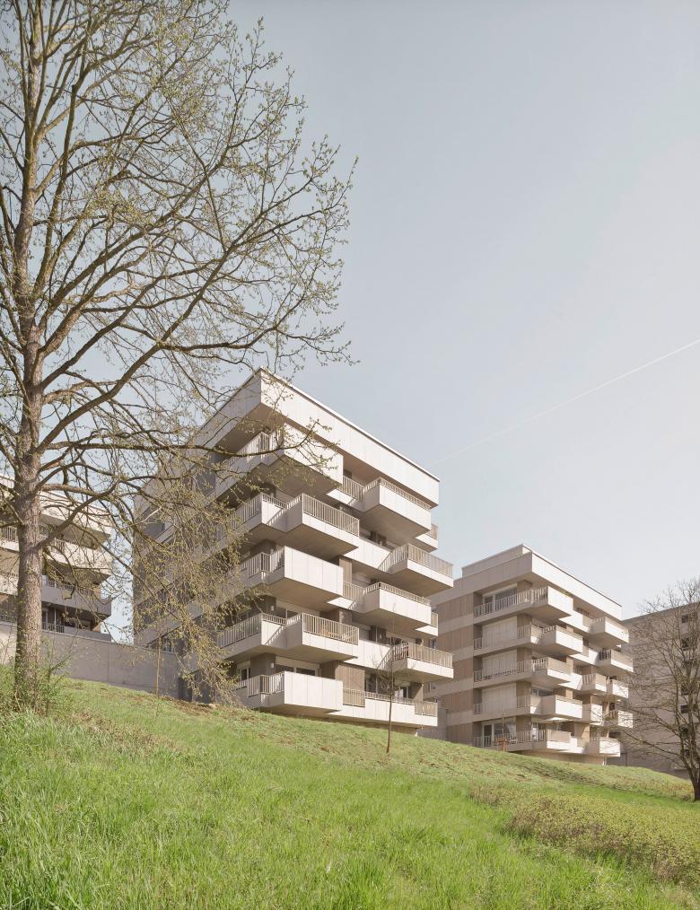 Baukörpereinschnitte bilden überdachte Vorzonen und eine klare Adressbildung der viergeschossigen Baukörper, die talseitig ein weiteres Geschoss ermöglichen.