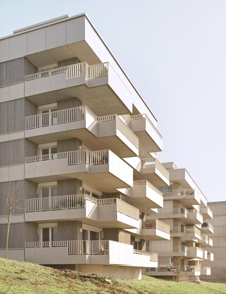 Geschützte, nicht einsehbare Balkone sowie großzügige Terrassenflächen unterschiedlicher Tiefe prägen das Fassadenbild nach Süden. Im Zusammenspiel mit raumhohen Verglasungen und elementierten Holzfassaden entsteht eine unverwechselbare Gestalt.