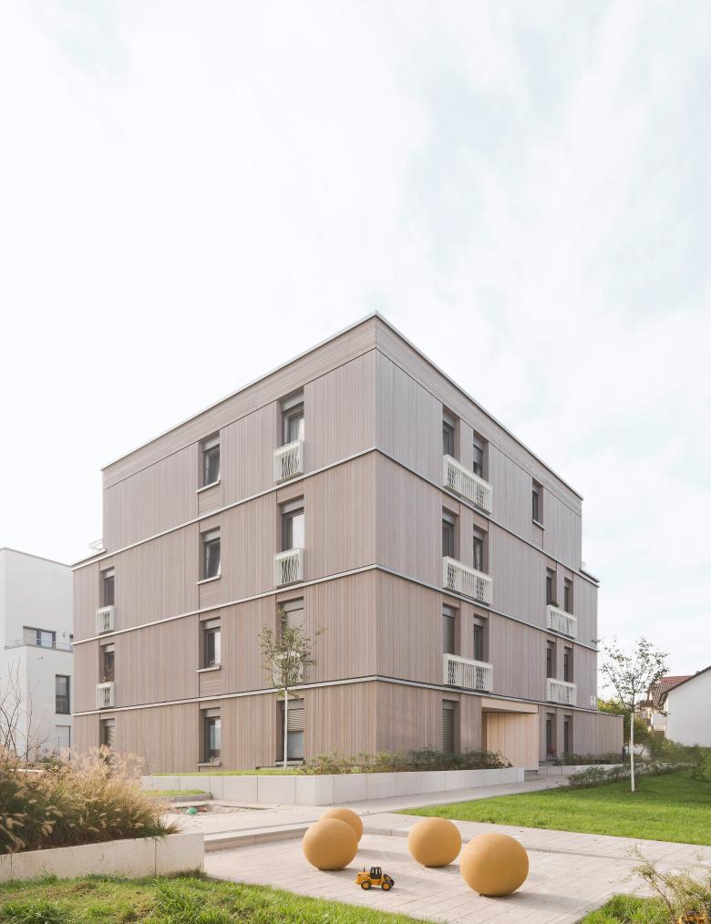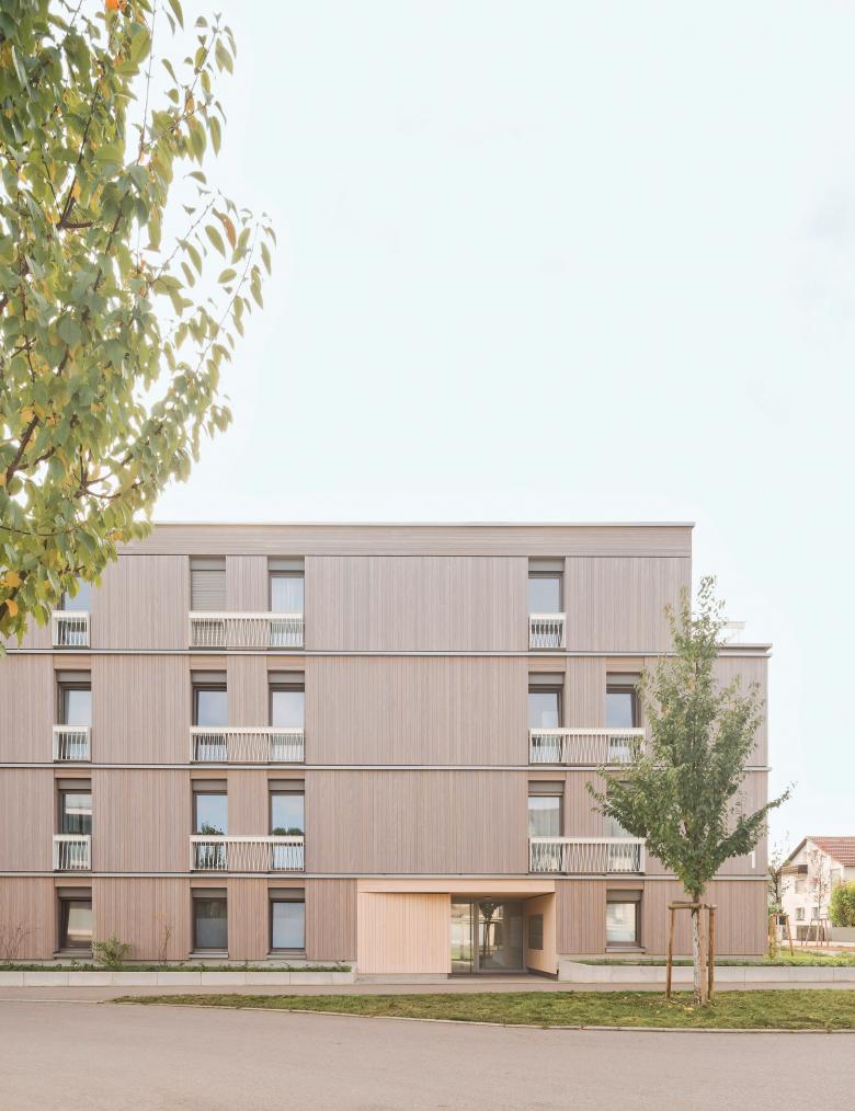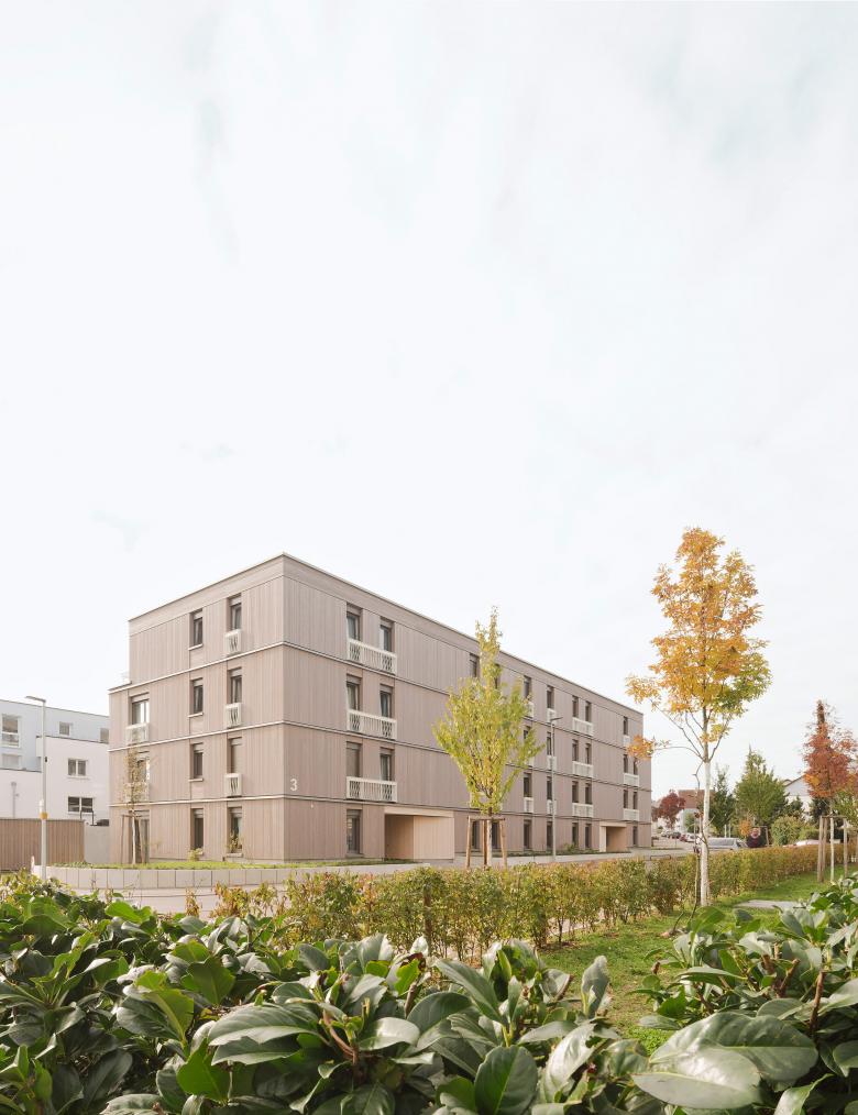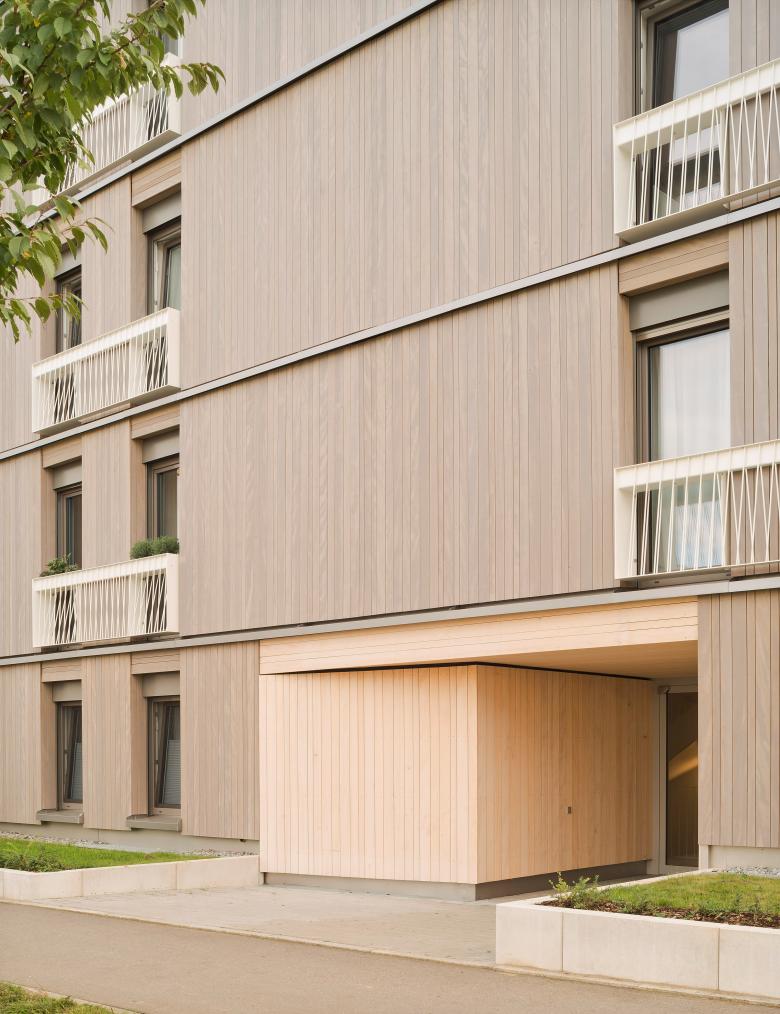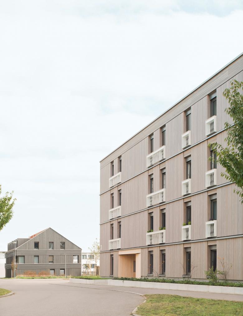 Hochgedämmte Holzfassaden mit hinterlüfteten, vorvergrauten Weisstannenschalungen bilden eine nachhaltige Fassadenbekleidung. Im Zusammenspiel mit Luft-Wärmepumpen und Photovoltaik erfüllen die Gebäude den KfW55-Standard.