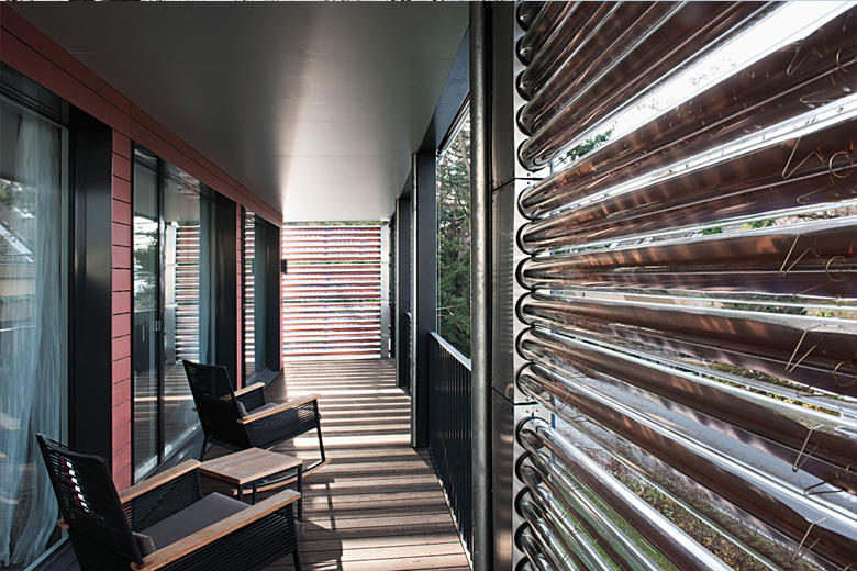 Von aussen ein ganz einfacher, fast würfelförmiger Bau mit roter Eternitverkleidung. Im Innern: drei Wohnungen komplex ineinander verschachtelt. Jede der drei Familienwohnungen ist zweigeschossig und verfügt über zwei Aussenräume verschiedenen Charakters. Das rote Volumen wird durch die anthrazitfarbenen Stahlkonstruktionen gegliedert. Die Felder aus Vakuumröhrenkollektoren nach Süden und Westen definieren die Loggias räumlich und lassen angenehme, wechselnde Lichtstimmungen entstehen. Fast nebenbei sorgen sie in Zusammenarbeit mit einer Erdsonden-Wärmepumpe für die notwendige Wärmeerzeugung.