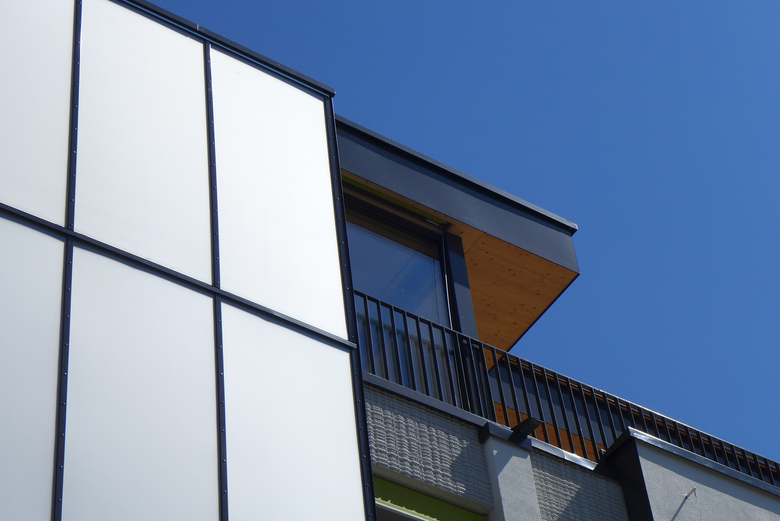 Rund 60 Personen bewohnen das Haus bei einem totalen Flächenbedarf von nur 35 m2 pro Person. Entsprechend hoch ist der Bedarf an Warmwasser. Die grossen geschlossenen Fassadenflächen und ein nicht mehr benötigter Abluftschacht der Tiefgarage führten zu einem neuartigen Energiekonzept: 180 m2 thermische Sonnenkollektoren in den Fassaden und ein 19 m hoher Wasserspeicher im ehemaligen Abluftschacht. Eine Wärmepumpe mit zwei Erdsonden und 180 m2 Photovoltaik auf dem Dach ergänzen das Energiesystem. Die Energieschleuder von damals ist nun vollumfänglich für die Anforderungen der neuen Zeit gerüstet. Die vertikalen Solarfelder strecken den Bau in die Höhe und sind mit einem von Bronze bis Silber changierenden Glas (Kromatix) abgedeckt. Daneben bewachst Hopfen einen Teil der Fassaden und leistet so einen Beitrag zur Stadtökologie.