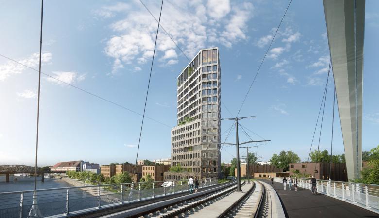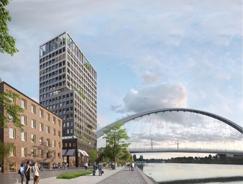 In seinem architektonischen Ausdruck und mit seiner verspielten Ziegelfassade bezieht sich der Entwurf auf den lokalen Kontext des neuen Stadtteils, der durch die Nähe zum Wasser und die Dominanz von Ziegeln definiert ist. Um die Vertikalität und Schlankheit des Turms zu betonen, nimmt der Anteil der Öffnungen in der Höhe zu und die Fassaden weisen nach oben einen Farbverlauf auf.