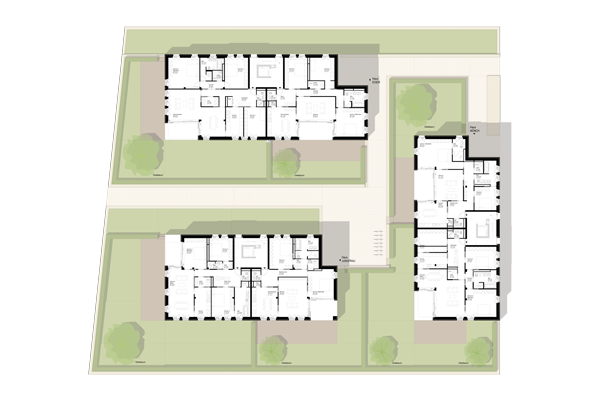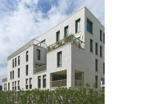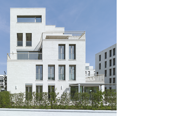 Die drei unterschiedlich positionierten und skulptural gestalteten Terrassenhäuser spannen einen qualitätsvollen, grosszügigen halbprivaten Aussenraum zwischen sich auf und bieten immer wieder Aus- und Durchblicke auf die umliegende Parklandschaft. Diese Differenzierung der Volumen erlaubt Individualisierung und Identifikation für die Eigentümer. Das Konzept bietet verschiedenartige Wohnungstypen, vom klassischen Grundriss bis hin zu offenen Raumfolgen. Jede Wohnung ist dreiseitig belichtet und hat direkten Sichtbezug zum Park. Im Außenraum entsteht durch Höhenstaffelung des Geländes eine Gliederung in öffentliche Erschließungsbereiche, halböffentliche Aufenthaltszonen und private Außenräume. Terrassen und Gärten bilden einen fließenden Übergang von innen nach außen. Innerhalb des Ensembles entstehen immer wieder Durchsichten auf die umliegende Parklandschaft.