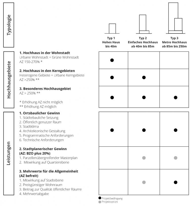 Es wurde eine Matrix entwickelt, welche Hochhäuser nach drei Typen differenziert. Jeder Typus darf lediglich in bestimmten Gebieten gebaut werden und muss mit zunehmender Höhe und Komplexität umfangreichere Leistungen für die Umgebung oder gar die Allgemeinheit erbringen.