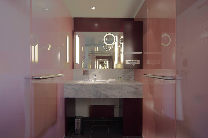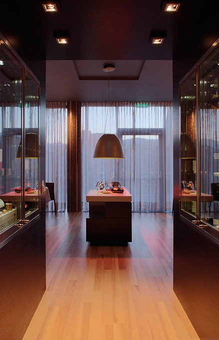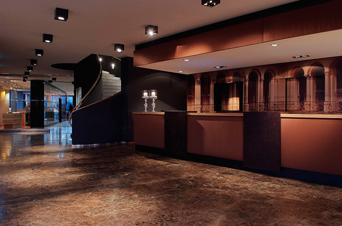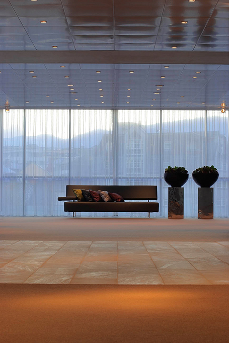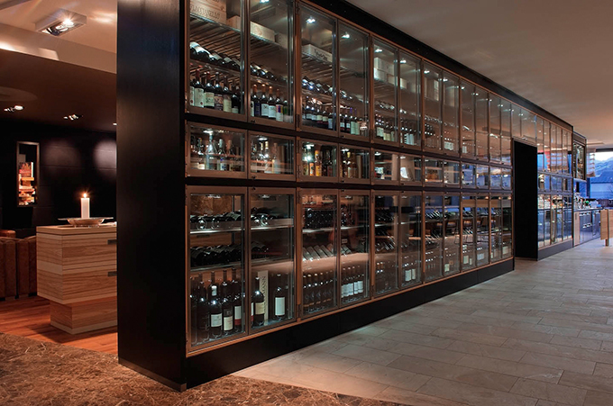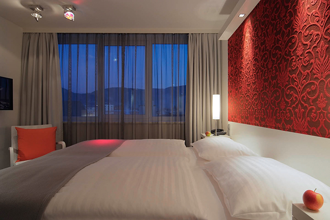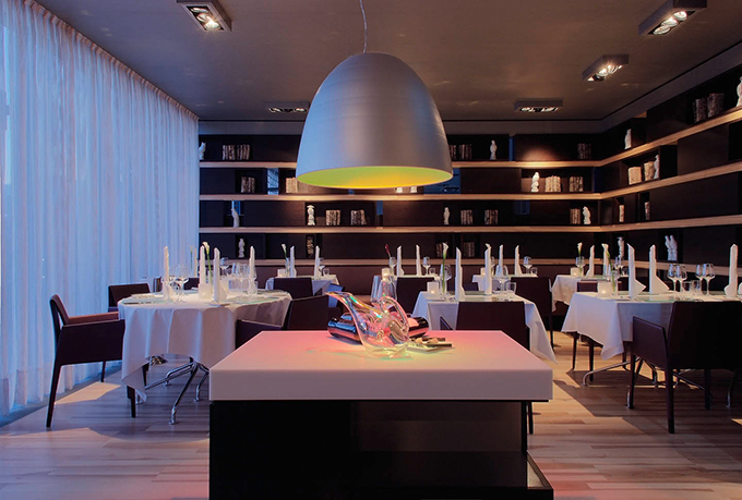 Man betritt das Hotel über eine anregend farbige Welt in Konfrontation mit historischen Eindrücken. Auf dem Weg zu seinem Zimmer, vorbei an einer sensationellen Weinwand wird man durch eine kulinarischen Landschaft geführt. Durch perforierte, warmtonige Holzbauten separierte Zonen markieren Inseln verschiedener kulinarischer Nutzung. Über die großzügige Verglasung fließen kraftvolle Eindrücke in die natürliche Gestaltungswelt des Hotels ein.