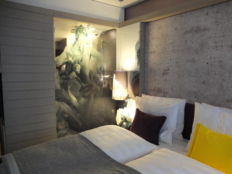 Die Flure führen zu den Oasen des Hotels, den Zimmer, markiert durch ihren farbigen Eingang. In unserem Design wird Neptun (als semitransparentes Bildmotiv) der verbindende Teil zwischen Bad und Zimmer. Er ist die ordnende Metapher zwischen Historie und Neuzeit, die vertreten wird durch ein Icon des Fernsehturms.