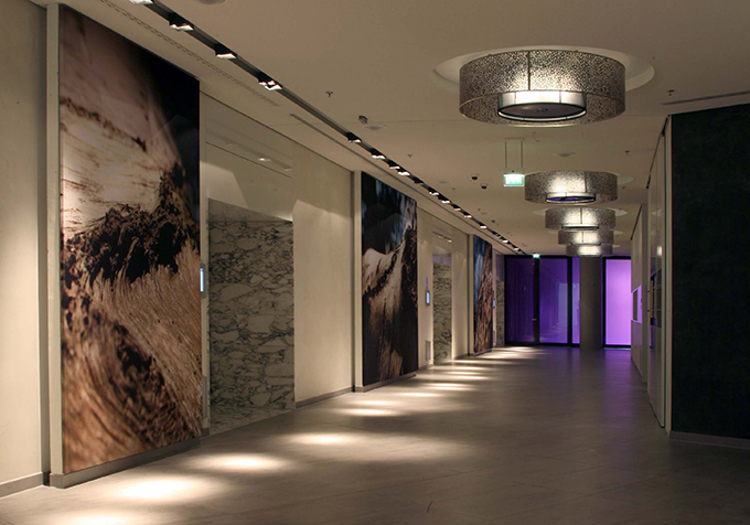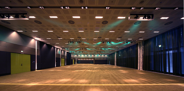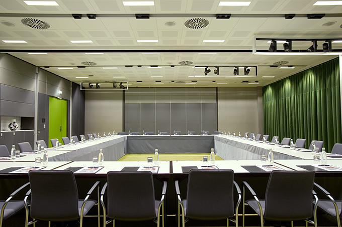 Die 8 Konferenzräume im Erdgeschoß erstrecken sich über 2 Gebäudeteile sind alle miteinander zu verbinden. Die Innenarchitektur der Konferenzräume integriert das Licht als architektonisches Mittel. Mit der durchgehenden Vektrondecke die als flächiges Element alle Funktionen, auch haustechnische, aufnimmt, konnte eine ästhetische Revisionsdecke von gut 1200 m² geschaffenen werden. Diese wird unterbrochen durch die vorgegebene Struktur der Trennwände (Schiebe- und Hubwände). Diese Struktur hat kA zur Rhythmisierung der Räume mit Licht und Einbauten aufgenommen. Lichtstreifen mit Dolma über die gesamte Raumbreite werden in der Wand über die gesamte Raumhöhe fortgeführt und „spiegeln“ sich im Teppichboden. Neueste RGB-LED Technik wurde im abgehängten Sonderelemente integriert. Die Farbkombination anthrazit / grün in den Wandverkleidungen ist beruhigend und anregend zugleich und wirkt sehr elegant. Der exakte Einbau dieser ineinander greifenden Elemente ist das Ergebnis detaillierte Ausführungsplanung und engagiertem Einsatz aller Beteiligten.