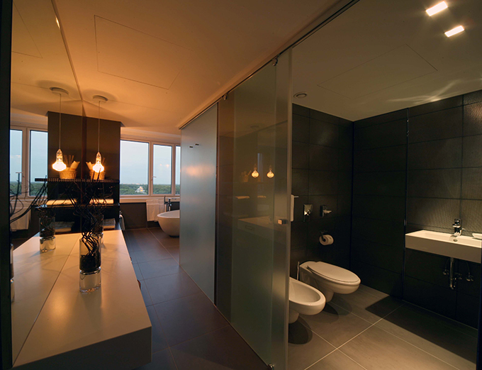Die Gästezimmer lösen sich von dem Grundgedanken, daß das Bad immer vom Flur aus zu begehen ist. Hier liegt der Zugang zum Bad im Zimmerbereich, mittels einer Schiebetür, die es erlaubt, auch ein völlig offenes Bad leben. Durch ein Fenster in der Badwand kann gleichzeitig auch ferngesehen werden.