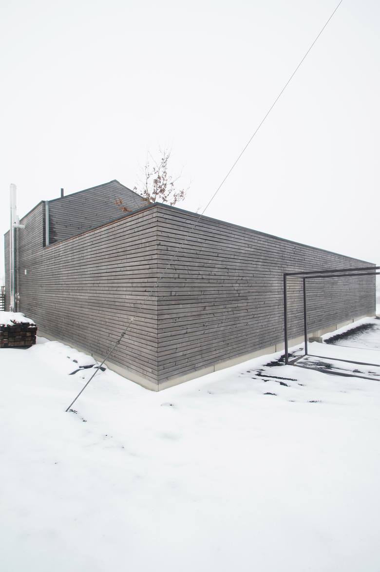 Das erratische Holzhaus im Übergang von Siedlung und Landschaft dient einer vierköpfigen Familie als Wochenend- und Feriendomizil. Der Hausherr nutzt es als Stützpunkt für die Jagd, das Versorgen der Jagdbeute und zum Bewirten von Gesellschaften im separierbaren Jagdzimmer. Eine Nutzbarkeit als zu einem späteren Zeitpunkt dauerhaft bewohntes Minimalhaus war gefordert.