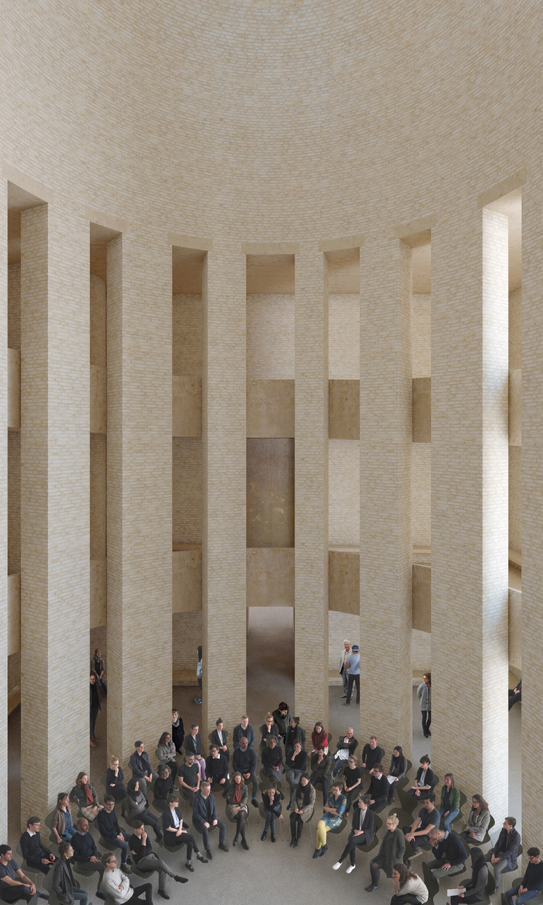 Im Zentrum Berlins entsteht am Petriplatz das House of One – ein interreligiöses Bet- und Lehrhaus für Juden, Christen und Muslime, das zugleich die säkulare Stadtgesellschaft adressiert. Ohne spektakulär zu sein, hebt sich der Baukörper in Form und Materialität deutlich von seiner Umgebung ab, unterbricht den städtischen Alltag. Gegenüber dem Stadtraum tritt der massive Sichtziegelbau als Einheit und frei jeder religiösen Symbolik auf. Die innere Ordnung jedoch löst sich von der Körperform. Hier behaupten die drei Religionen ihre Autonomie. Eine Synagoge, eine Kirche und eine Moschee bilden heterogene Raumkörper, die sich wie Häuser um einen zentralen Platz gruppieren, der zugleich Leer- und Lehrraum ist.