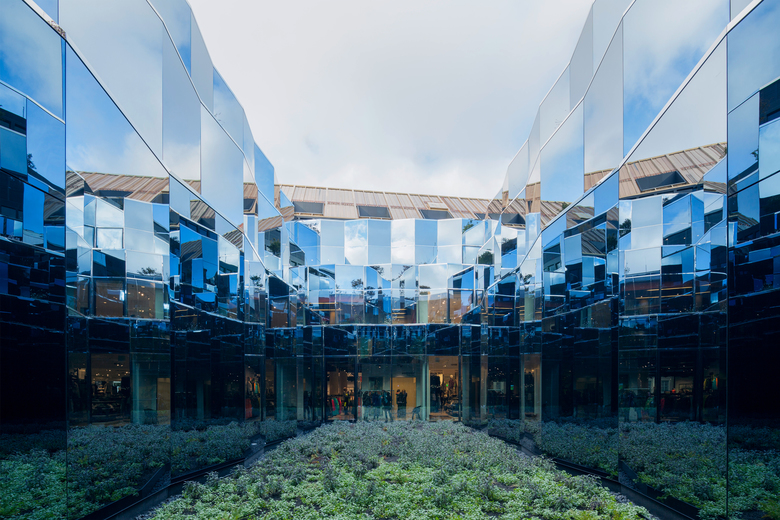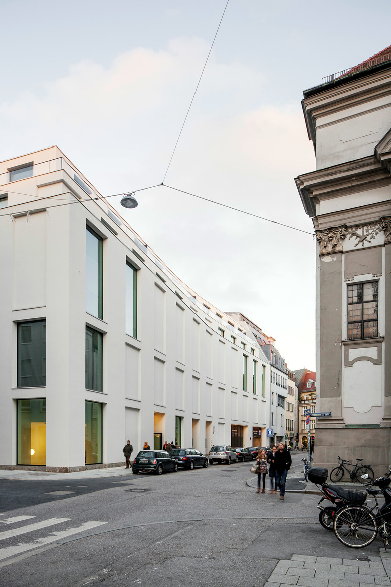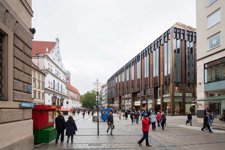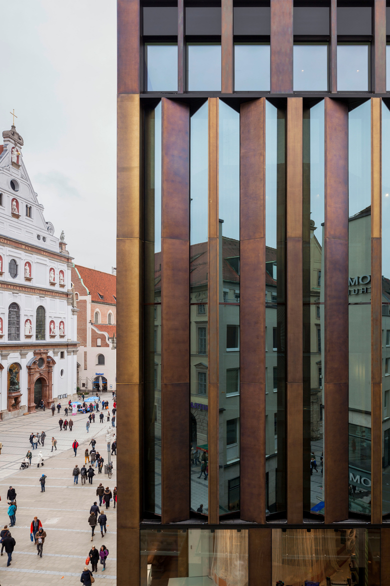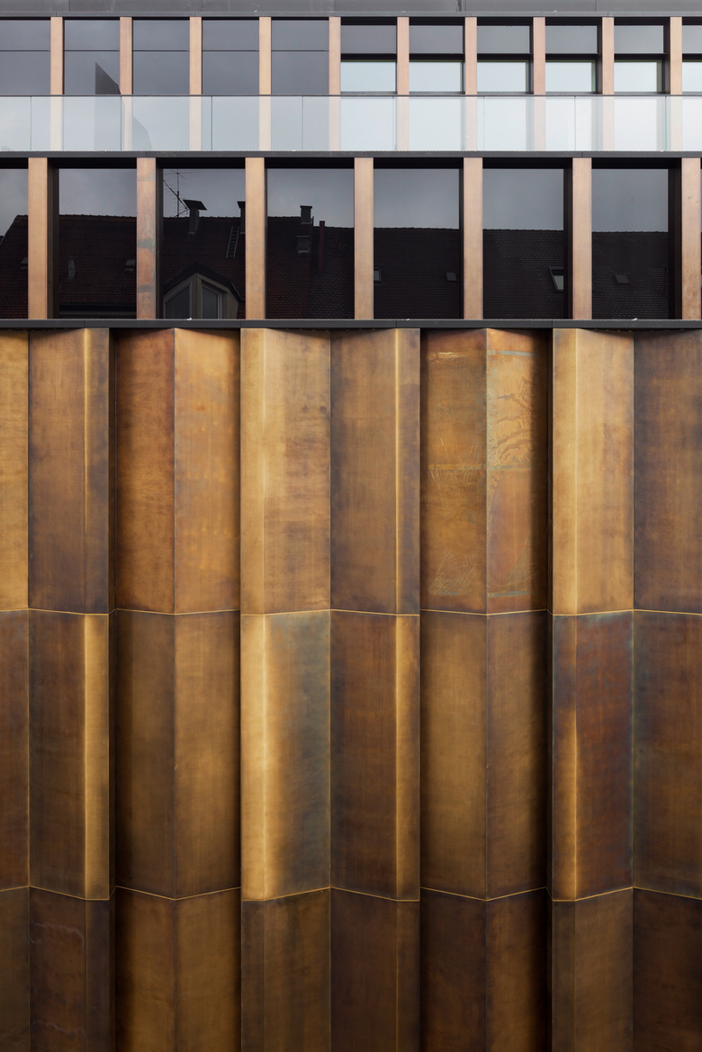 Das Geschäftshaus ist ein Stück Stadt, das flexible Handelsflächen mit hochwertigen Wohntypologien sowie gestalteten Freiräumen vereint. Drei differenzierte Baukörper integrieren das Geschäftshaus feingliedrig in den Stadtraum und schaffen unterschiedliche Adressen an jeder der drei Vorderseiten. Im Zentrum der Anlage steht ein Innenhof, der sich entlang eines dreigeschossiges Gewächshauses, nach oben weitet und in einen großzügigen Dachgarten übergeht. Bronzefassaden und -fenster charakterisieren den Baukörper als zeitgenössische Interpretation historischen Bauhandwerks. Auf der Südfassade sorgt der hell verputzte Baukörper mit Einzelfenstern für eine eigenständige Präsenz und fügt sich dabei elegant in die historische Bebauung des angrenzenden Wohnviertels ein.