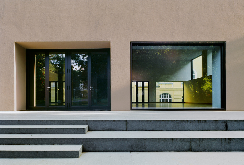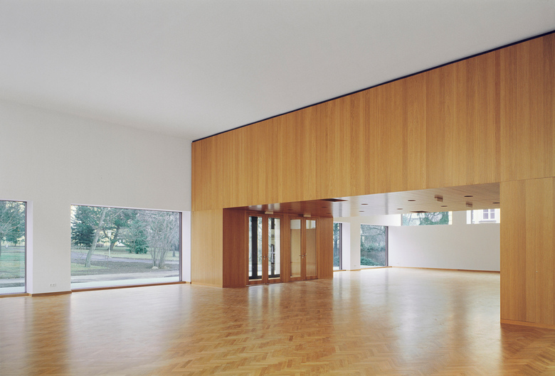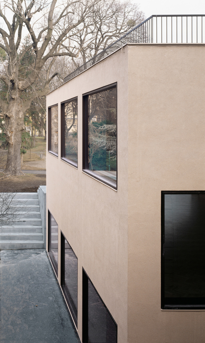 Der Umbau des denkmalgeschützten barocken Maria-Theresien-Schlössels zu einer Berufsakademie mit Internat basiert auf der Grundidee des Campus: einer Gebäudeformation um einen zentralen baumbestandenen Freiraum herum. Im nördlichen zwei- bis dreigeschossigen Gebäudekörper an der Hofzeile werden 1200 m2 Seminarräume und 750 m2 Verwaltung untergebracht. Das Hauptgebäude an der Pyrkergasse im Süden nimmt mit 2700 m2 das Internat auf. Im Hof des Schlössels wird auf bestehenden Grundmauern ein Pavillon errichtet, in dem mit 1000 m2 NGF die kollektiven Räume für Mensa und Hörsäle realisiert werden. Besondere Aufmerksamkeit gilt den räumlichen und funktionalen Bezügen des Pavillons: am übergang zwischen Altbau und Garten entsteht ein neues Zentrum, das auf vielfältige Weise mit seiner Umgebung in Beziehung tritt. Im Erdgeschoss wird die Mensa vom Bestand erschlossen und orientiert sich seitlich zum Garten; im Hauptgeschoss profitieren die Hörsäle von einem zweiseitigen Zugang sowohl von innen als auch vom Garten aus; das Dach schliesslich dient als kollektive Terrasse des Internats.