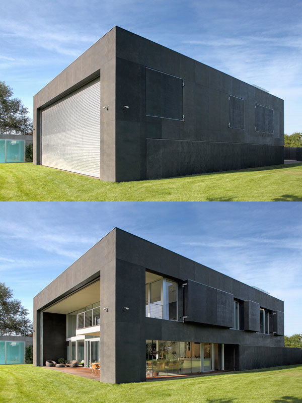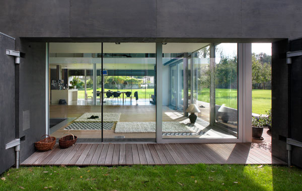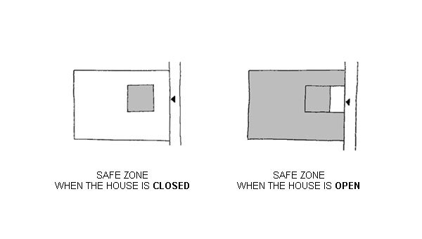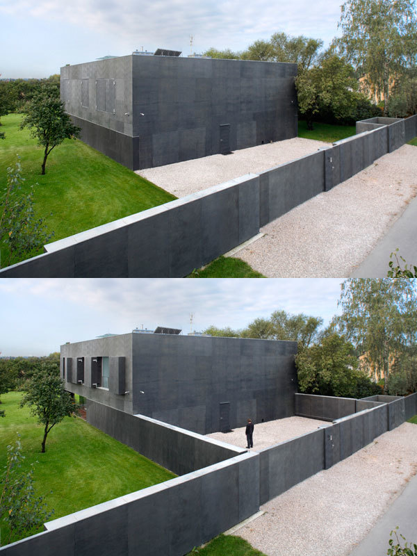 The most essential item of the project was acquiring the feeling of maximum security for the inhabitants. The building is a rectangular prism in which parts of the walls are movable. When the house opens up for the garden, eastern and western side walls move towards an exterior fence, creating a safety zone where one waits for the door to be open. The innovation of this consists in an interference of the movable walls into the urban structure of the property. As a result when the house is closed (at night for example) the safety zone is limited to the house outline. During the day as a result of opening of the walls it is expanded of the garden surrounding the house.