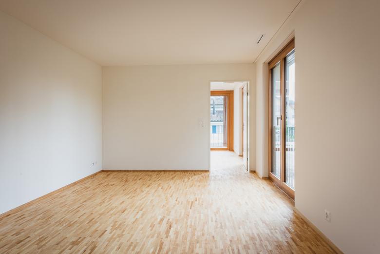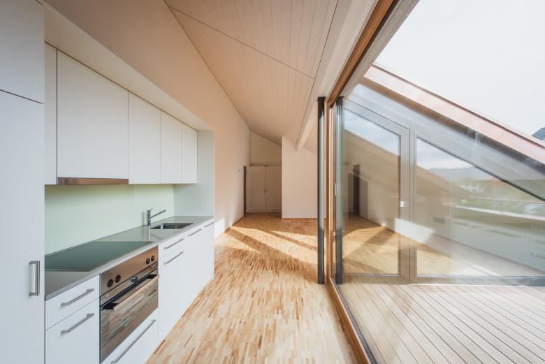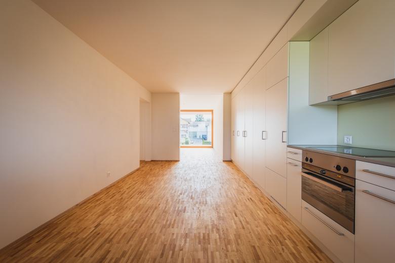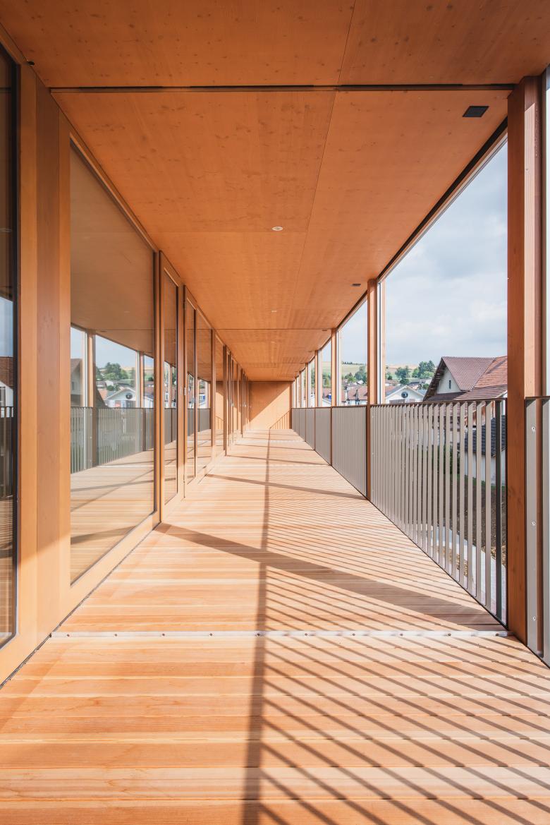 Die Lauben erschliessen die kleinen Wohnungen effizient und sind zugleich Begegnungszonen und zusätzliche Aussenräume. Sie werden mit Sitzbänken als Ankunfts- und Ruheplätze vor den Wohnungen und Sichtbeziehungen der Wohnungen zur Laube attraktiv gestaltet.
