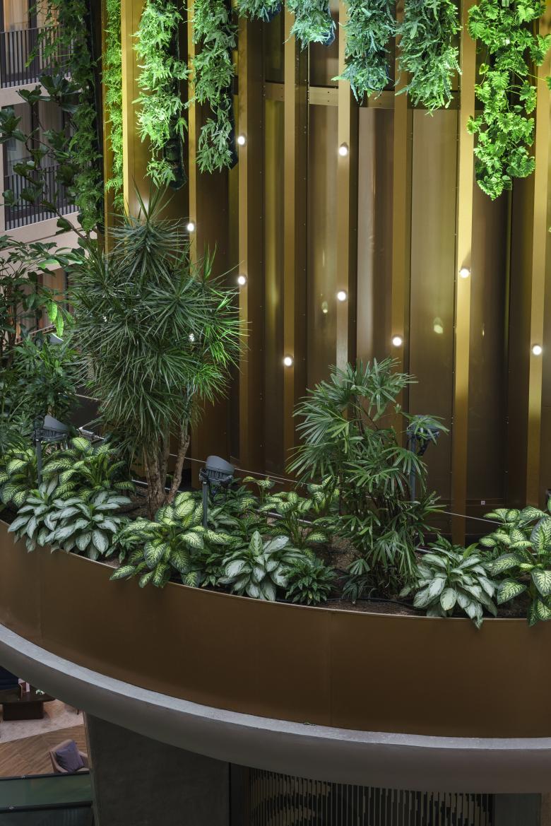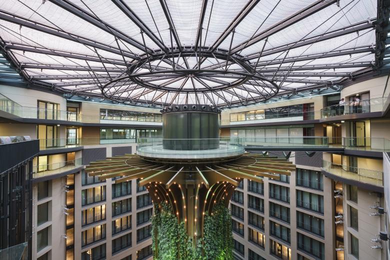 Die Installation Living Tree im Innenhof des Radisson Berlin integriert einen vertikalen Garten in eine Lamellenstruktur.