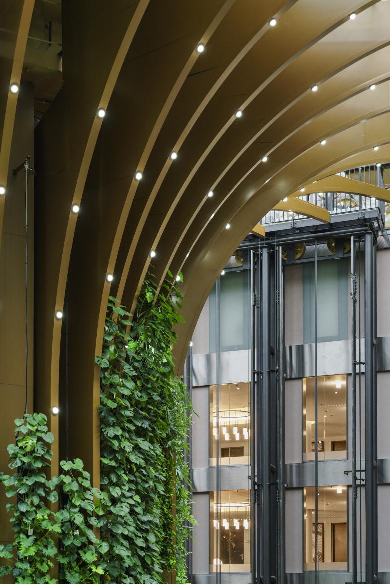 RGBL-Bühnenstrahler aus vier Ecken sorgen für 1000 Lux Pflanzenlicht, während RGBW-Streiflichter aus dem Podium den vertikalen Garten farbig akzentuieren. RGBW-Lichtpunkte an den Lamellen setzen spielerische Highlights, und die oberen Lamellen erzeugen einen sanften Glow auf die transparente Dachhaut.