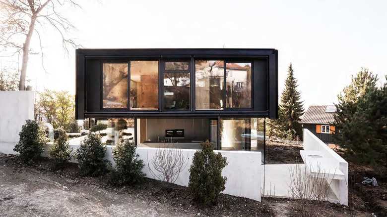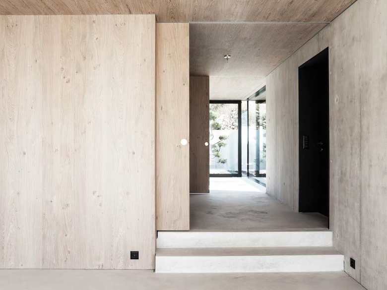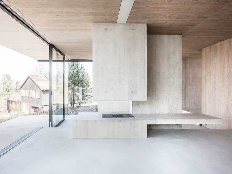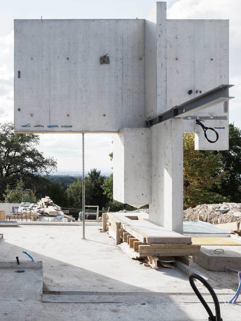 Das Haus nimmt im Erdgeschoss aus Sichtbeton die Topographie auf. Umliegende feine Stützmauern fassen Aussenräume, formen den Garten und fügen das Gebäude in die Umgebung ein. Das obere Geschoss aus Holz liegt filigran darüber. Die beiden strukturellen Materialien Beton und Holz greifen in wesentlichen Situationen ineinander.