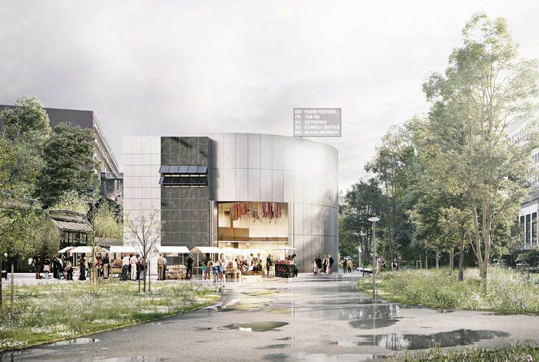 Das neue Konzerthaus für die Kuppel knüpft an die Geschichte und die Spuren des Ortes im Nachtigallenwäldeli an. Die entwerferische Herangehensweise versteht die Stadt als gewachsene, heterogene Struktur mit identitätsstiftenden Spuren. Vorgefundene Elemente werden aufgenommen, adaptiert und weiterentwickelt. Nach aussen tritt das neue Konzerthaus als Gebäude in verzinktem Stahl und Marmor in Erscheinung. Die Dualität der beiden Materialien Metall und Stein definiert zwei Gebäudekörper mit jeweils spezifischen Nutzungen. Das metallische, runde Volumen beinhaltet sämtliche musikalische Nutzungen, wie den Konzertsaal und die Bandproberäume. Der haptische, murale Körper beinhaltet sämtliche dienende Nutzungen. Die beiden Gebäudekörper bedingen und ergänzen sich folglich. Als drittes Element der Komposition ist die Anzeigetafel als Dachaufbau positioniert. Zusammen bilden die einzelnen Gebäudefragmente eine sich bedingende Einheit, ein neues Ganzes. Die Vielfältigkeit der Musikrichtungen und Veranstaltungen soll sich in der architektonischen Gestaltung und der Formgebung der Neuen Kuppel wiederfinden.