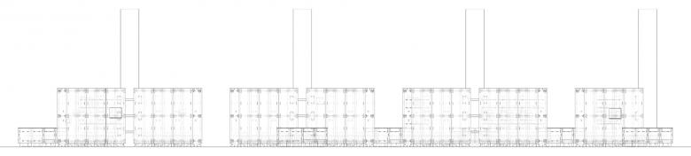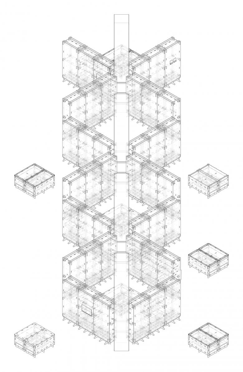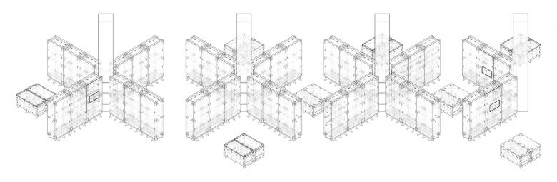 With corrugated cardboards as structural components, CNC cutting technique was used to make concave and convex edges, through which a structure of "mortise and tenon" is created, to form insert buckles of the cardboards. Taking firmness into consideration, boards with two different thickness (15mm and 20mm) have been selected, with a standard size of 1.2m long and 2.4m wide. The smallest modular unit for the cardboard wall is 1.2m wide by 2.4m high, with a thickness of 0.6m. Beside the six pieces of cardboard installed at top and bottom, left and right, and front and back, a fixed connection plate is also added in the 2.4m-high middle section, in order to ensure the structural stability. With a wide of 1.2m, each modular wall unit has slots on the upper and lower sides for horizontal connection. Therefore, a quarter of the "X-wall" can be made by three 1.2m-wide modular cardboards.