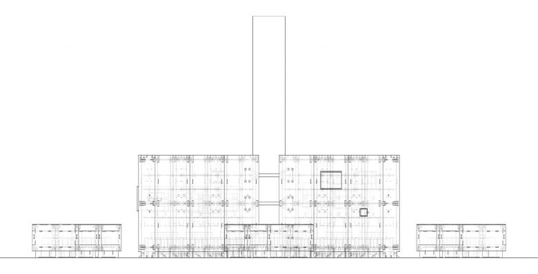 The existing space is rectangular, which is about 40m long, 16.5m wide and 6m high, with a row of concrete columns in the middle. The columns, that have a very strong presence, are 40cm-wide each, and the distance between them is 7.4 meters. A large number of traces of wrapping, hanging, drilling, and demolition have been left on the surface of these columns, which indicates that many exhibition activities previously held here have taken rapid construction and demolition, causing irreversible damage. A lot of metal connecting components for anchoring are reserved on the columns, which seems to default to an exhibition construction method that has to wrap and hide these columns.